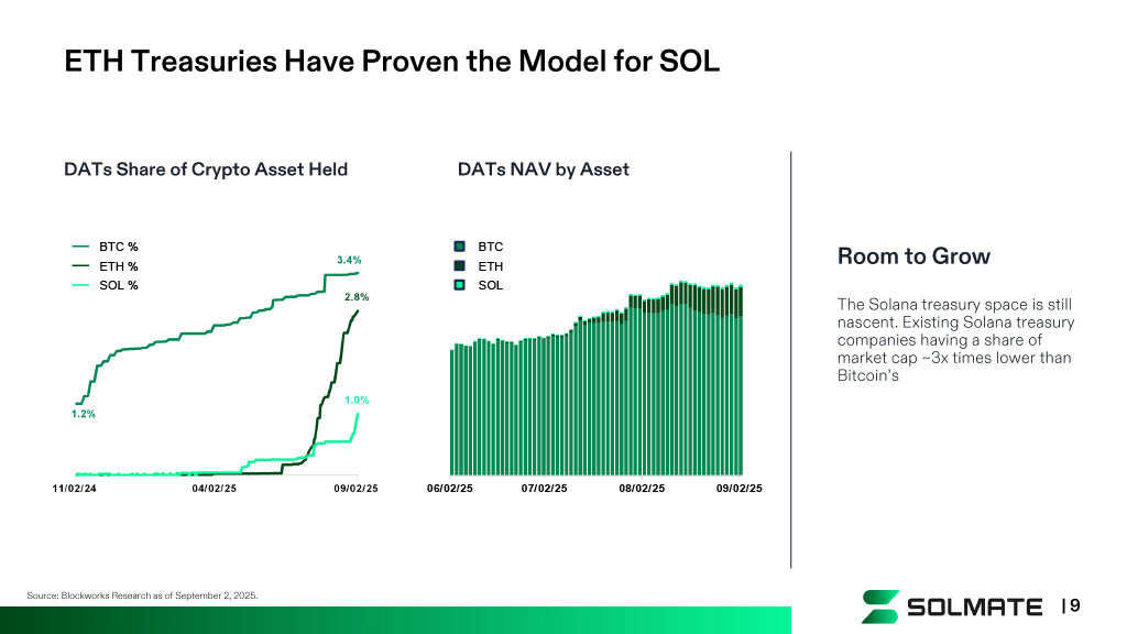 Room to Grow The Solana treasury space is still nascent. Existing Solana treasury companies having a share of market cap ~3x times lower than Bitcoin’s DATs Share of Crypto Asset Held DATs NAV by Asset ETH Treasuries Have Proven the Model for SOL | 9 Source: Blockworks Research as of September 2, 2025. BTC % ETH % SOL % 09/… 08/… 07/… 06/02/25 07/02/25 08/02/25 09/02/25 BTC ETH SOL