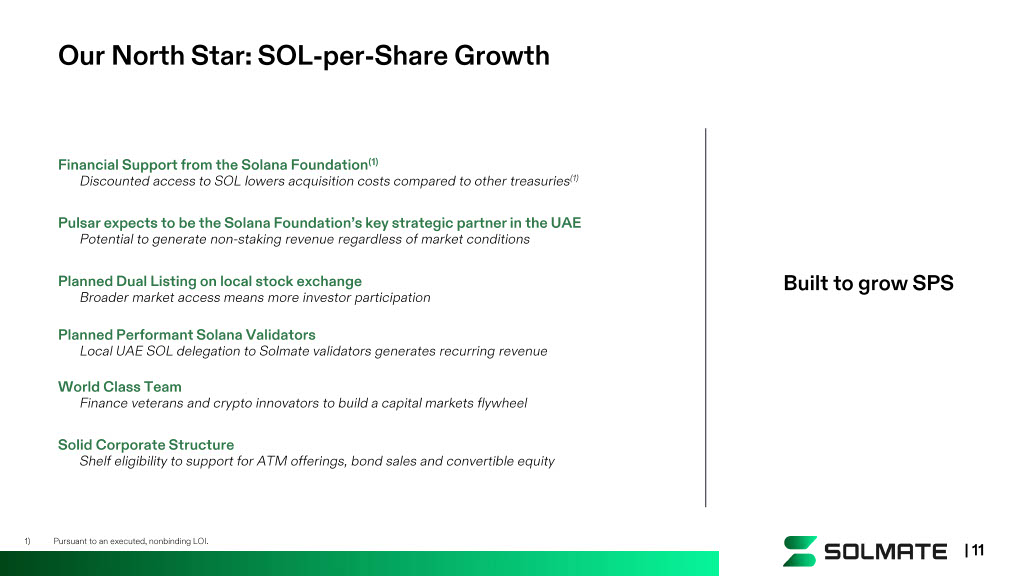 Financial Support from the Solana Foundation (1) Discounted access to SOL lowers acquisition costs compared to other treasuries (1) Pulsar expects to be the Solana Foundation’s key strategic partner in the UAE Potential to generate non - staking revenue regardless of market conditions Planned Performant Solana Validators Local UAE SOL delegation to Solmate validators generates recurring revenue Planned Dual Listing on local stock exchange Broader market access means more investor participation | 8 Our North Star: SOL - per - Share Growth World Class Team Finance veterans and crypto innovators to build a capital markets flywheel Solid Corporate Structure Shelf eligibility to support for ATM offerings, bond sales and convertible equity Built to grow SPS | 11 1) Pursuant to an executed, nonbinding LOI.