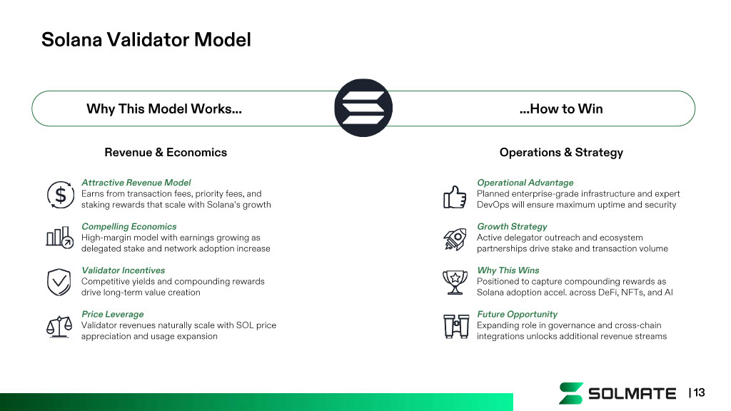 Attractive Revenue Model Earns from transaction fees, priority fees, and staking rewards that scale with Solana’s growth Compelling Economics High - margin model with earnings growing as delegated stake and network adoption increase Validator Incentives Competitive yields and compounding rewards drive long - term value creation Price Leverage Validator revenues naturally scale with SOL price appreciation and usage expansion Why This Model Works… …How to Win Revenue & Economics Operations & Strategy Operational Advantage Planned enterprise - grade infrastructure and expert DevOps will ensure maximum uptime and security Growth Strategy Active delegator outreach and ecosystem partnerships drive stake and transaction volume Why This Wins Positioned to capture compounding rewards as Solana adoption accel. across DeFi, NFTs, and AI Future Opportunity Expanding role in governance and cross - chain integrations unlocks additional revenue streams Solana Validator Model | 13