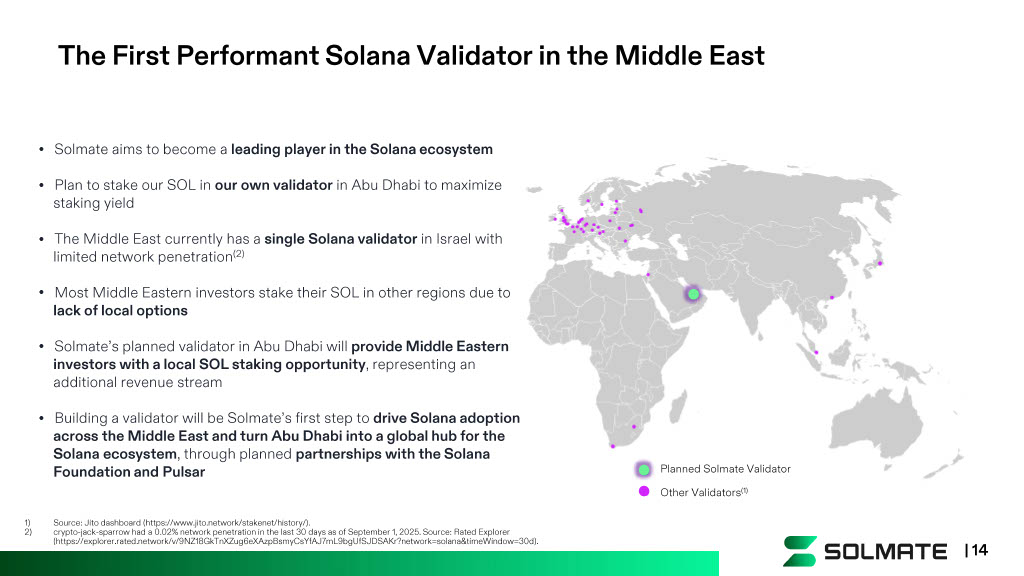 • Solmate aims to become a leading player in the Solana ecosystem • Plan to stake our SOL in our own validator in Abu Dhabi to maximize staking yield • The Middle East currently has a single Solana validator in Israel with limited network penetration (2) • Most Middle Eastern investors stake their SOL in other regions due to lack of local options • Solmate’s planned validator in Abu Dhabi will provide Middle Eastern investors with a local SOL staking opportunity , representing an additional revenue stream • Building a validator will be Solmate’s first step to drive Solana adoption across the Middle East and turn Abu Dhabi into a global hub for the Solana ecosystem , through planned partnerships with the Solana Foundation and Pulsar Planned Solmate Validator Other Validators (1) The First Performant Solana Validator in the Middle East | 14 1) Source: Jito dashboard (https://www.jito.network/stakenet/history/). 2) crypto - jack - sparrow had a 0.02% network penetration in the last 30 days as of September 1, 2025. Source: Rated Explorer (https://explorer.rated.network/v/9NZ18GkTnXZug6eXAzpBsmyCsYfAJ7mL9bgUfSJDSAKr?network=solana&timeWindow=30d).