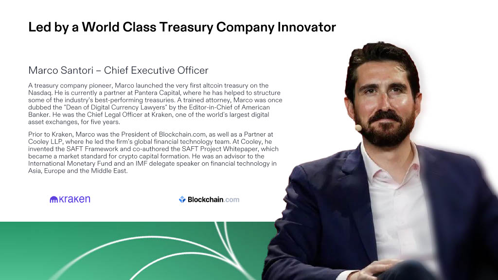 Marco Santori – Chief Executive Officer A treasury company pioneer, Marco launched the very first altcoin treasury on the Nasdaq. He is currently a partner at Pantera Capital, where he has helped to structure some of the industry’s best - performing treasuries. A trained attorney, Marco was once dubbed the "Dean of Digital Currency Lawyers" by the Editor - in - Chief of American Banker. He was the Chief Legal Officer at Kraken, one of the world's largest digital asset exchanges, for five years. Prior to Kraken, Marco was the President of Blockchain.com, as well as a Partner at Cooley LLP, where he led the firm’s global financial technology team. At Cooley, he invented the SAFT Framework and co - authored the SAFT Project Whitepaper, which became a market standard for crypto capital formation. He was an advisor to the International Monetary Fund and an IMF delegate speaker on financial technology in Asia, Europe and the Middle East. Led by a World Class Treasury Company Innovator | 10