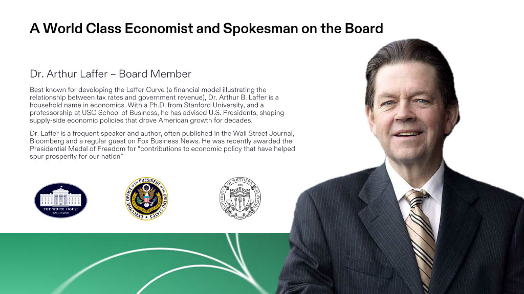 Dr. Arthur Laffer – Board Member Best known for developing the Laffer Curve (a financial model illustrating the relationship between tax rates and government revenue), Dr. Arthur B. Laffer is a household name in economics. With a Ph.D. from Stanford University, and a professorship at USC School of Business, he has advised U.S. Presidents, shaping supply - side economic policies that drove American growth for decades. Dr. Laffer is a frequent speaker and author, often published in the Wall Street Journal, Bloomberg and a regular guest on Fox Business News. He was recently awarded the Presidential Medal of Freedom for “contributions to economic policy that have helped spur prosperity for our nation” A World Class Economist and Spokesman on the Board | 10 | 16