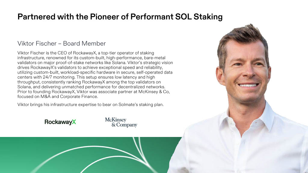 Viktor Fischer – Board Member Viktor Fischer is the CEO of RockawayX , a top - tier operator of staking infrastructure, renowned for its custom - built, high - performance, bare - metal validators on major proof - of - stake networks like Solana. Viktor’s strategic vision drives RockawayX’s validators to achieve exceptional speed and reliability, utilizing custom - built, workload - specific hardware in secure, self - operated data centers with 24/7 monitoring. This setup ensures low latency and high throughput, consistently ranking RockawayX among the top validators on Solana, and delivering unmatched performance for decentralized networks. Prior to founding RockawayX , Viktor was associate partner at McKinsey & Co, focused on M&A and Corporate Finance. Viktor brings his infrastructure expertise to bear on Solmate’s staking plan. Partnered with the Pioneer of Performant SOL Staking | 10 | 13