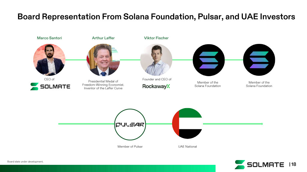 Member of Pulsar UAE National Board Representation From Solana Foundation, Pulsar, and UAE Investors Viktor Fischer Marco Santori Member of the Solana Foundation Member of the Solana Foundation Founder and CEO of CEO of Arthur Laffer Presidential Medal of Freedom - Winning Economist. Inventor of the Laffer Curve | 18 Board slate under development.