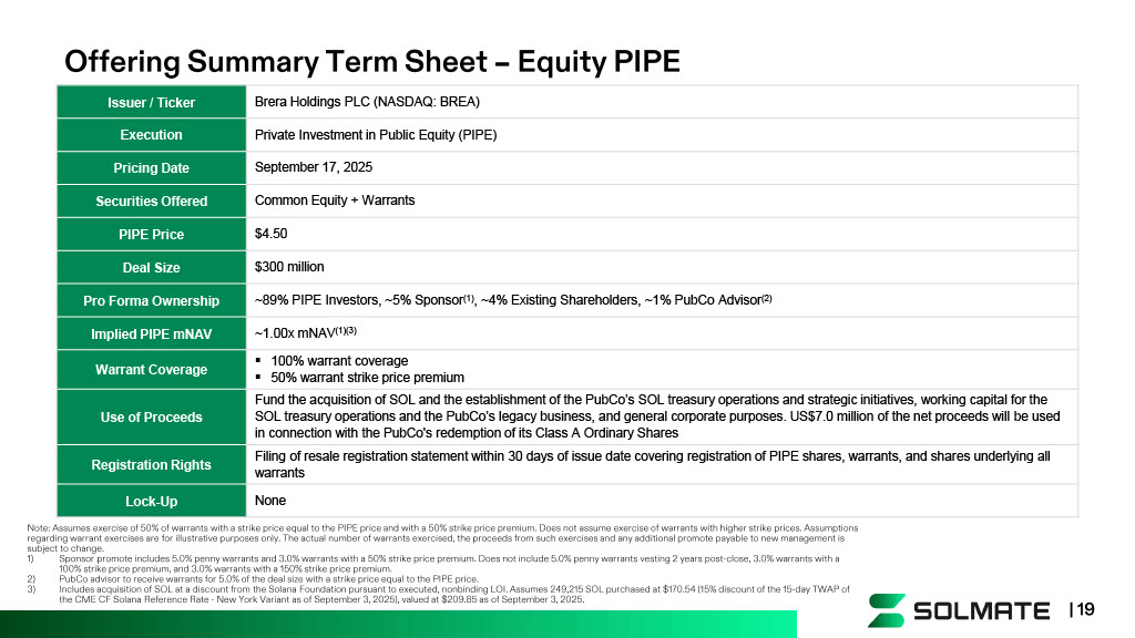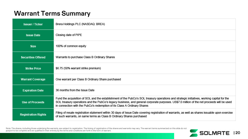Offering Summary Term Sheet – Equity PIPE | 19 Note: Assumes exercise of 50% of warrants with a strike price equal to the PIPE price and with a 50% strike price premium. Do es not assume exercise of warrants with higher strike prices. Assumptions regarding warrant exercises are for illustrative purposes only. The actual number of warrants exercised, the proceeds from su ch exercises and any additional promote payable to new management is subject to change. 1) Sponsor promote includes 5.0% penny warrants and 3.0% warrants with a 50% strike price premium. Does not include 5.0% penny w arr ants vesting 2 years post - close, 3.0% warrants with a 100% strike price premium, and 3.0% warrants with a 150% strike price premium. 2) PubCo advisor to receive warrants for 5.0% of the deal size with a strike price equal to the PIPE price. 3) Includes acquisition of SOL at a discount from the Solana Foundation pursuant to executed, nonbinding LOI. Assumes 249,215 SO L p urchased at $170.54 (15% discount of the 15 - day TWAP of the CME CF Solana Reference Rate - New York Variant as of September 3, 2025), valued at $209.85 as of September 3, 2025. Brera Holdings PLC (NASDAQ: BREA) Issuer / Ticker Private Investment in Public Equity (PIPE) Execution September 17, 2025 Pricing Date Common Equity + Warrants Securities Offered $4.50 PIPE Price $300 million Deal Size ~89% PIPE Investors , ~5% Sponsor (1) , ~4% Existing Shareholders, ~1% PubCo Advisor (2) Pro Forma Ownership ~1.00x mNAV (1)(3) Implied PIPE mNAV ▪ 100% warrant coverage ▪ 50% warrant strike price premium Warrant Coverage Fund the acquisition of SOL and the establishment of the PubCo’s SOL treasury operations and strategic initiatives, working capital for the SOL treasury operations and the PubCo’s legacy business, and general corporate purposes. US$7.0 million of the net proceeds will be used in connection with the PubCo's redemption of its Class A Ordinary Shares Use of Proceeds Filing of resale registration statement within 30 days of issue date covering registration of PIPE shares, warrants, and shar es underlying all warrants Registration Rights None Lock - Up