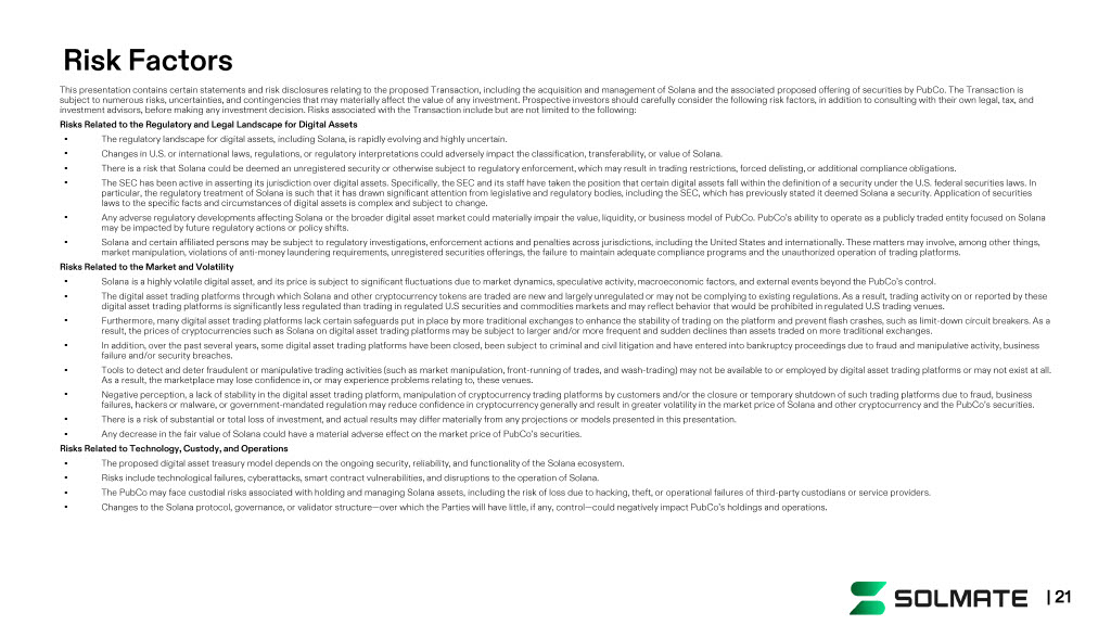 This presentation contains certain statements and risk disclosures relating to the proposed Transaction, including the acquis iti on and management of Solana and the associated proposed offering of securities by PubCo . The Transaction is subject to numerous risks, uncertainties, and contingencies that may materially affect the value of any investment. Prospecti ve investors should carefully consider the following risk factors, in addition to consulting with their own legal, tax, and investment advisors, before making any investment decision. Risks associated with the Transaction include but are not limited to the following: Risks Related to the Regulatory and Legal Landscape for Digital Assets • The regulatory landscape for digital assets, including Solana, is rapidly evolving and highly uncertain. • Changes in U.S. or international laws, regulations, or regulatory interpretations could adversely impact the classification, tra nsferability, or value of Solana. • There is a risk that Solana could be deemed an unregistered security or otherwise subject to regulatory enforcement, which ma y r esult in trading restrictions, forced delisting, or additional compliance obligations. • The SEC has been active in asserting its jurisdiction over digital assets. Specifically, the SEC and its staff have taken the po sition that certain digital assets fall within the definition of a security under the U.S. federal securities laws. In particular, the regulatory treatment of Solana is such that it has drawn significant attention from legislative and regulator y b odies, including the SEC, which has previously stated it deemed Solana a security. Application of securities laws to the specific facts and circumstances of digital assets is complex and subject to change. • Any adverse regulatory developments affecting Solana or the broader digital asset market could materially impair the value, l iqu idity, or business model of PubCo . PubCo’s ability to operate as a publicly traded entity focused on Solana may be impacted by future regulatory actions or policy shifts. • Solana and certain affiliated persons may be subject to regulatory investigations, enforcement actions and penalties across j uri sdictions, including the United States and internationally. These matters may involve, among other things, market manipulation, violations of anti - money laundering requirements, unregistered securities offerings, the failure to maintai n adequate compliance programs and the unauthorized operation of trading platforms. Risks Related to the Market and Volatility • Solana is a highly volatile digital asset, and its price is subject to significant fluctuations due to market dynamics, specu lat ive activity, macroeconomic factors, and external events beyond the PubCo’s control. • The digital asset trading platforms through which Solana and other cryptocurrency tokens are traded are new and largely unreg ula ted or may not be complying to existing regulations. As a result, trading activity on or reported by these digital asset trading platforms is significantly less regulated than trading in regulated U.S securities and commodities mark ets and may reflect behavior that would be prohibited in regulated U.S trading venues. • Furthermore, many digital asset trading platforms lack certain safeguards put in place by more traditional exchanges to enhan ce the stability of trading on the platform and prevent flash crashes, such as limit - down circuit breakers. As a result, the prices of cryptocurrencies such as Solana on digital asset trading platforms may be subject to larger and/or more fr equent and sudden declines than assets traded on more traditional exchanges. • In addition, over the past several years, some digital asset trading platforms have been closed, been subject to criminal and ci vil litigation and have entered into bankruptcy proceedings due to fraud and manipulative activity, business failure and/or security breaches. • Tools to detect and deter fraudulent or manipulative trading activities (such as market manipulation, front - running of trades, a nd wash - trading) may not be available to or employed by digital asset trading platforms or may not exist at all. As a result, the marketplace may lose confidence in, or may experience problems relating to, these venues. • Negative perception, a lack of stability in the digital asset trading platform, manipulation of cryptocurrency trading platfo rms by customers and/or the closure or temporary shutdown of such trading platforms due to fraud, business failures, hackers or malware, or government - mandated regulation may reduce confidence in cryptocurrency generally and result in greater volatility in the market price of Solana and other cryptocurrency and the PubCo’s securities. • There is a risk of substantial or total loss of investment, and actual results may differ materially from any projections or mod els presented in this presentation. • Any decrease in the fair value of Solana could have a material adverse effect on the market price of PubCo’s securities. Risks Related to Technology, Custody, and Operations • The proposed digital asset treasury model depends on the ongoing security, reliability, and functionality of the Solana ecosy ste m. • Risks include technological failures, cyberattacks, smart contract vulnerabilities, and disruptions to the operation of Solan a. • The PubCo may face custodial risks associated with holding and managing Solana assets, including the risk of loss due to hacking, theft , or operational failures of third - party custodians or service providers. • Changes to the Solana protocol, governance, or validator structure — over which the Parties will have little, if any, control — coul d negatively impact PubCo’s holdings and operations. Risk Factors | 21