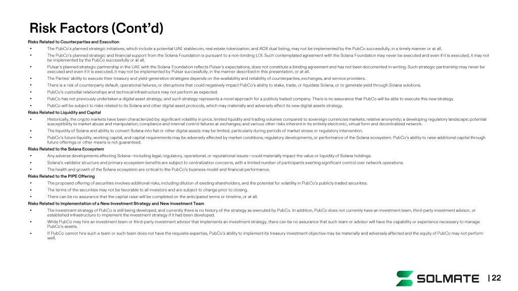 Risks Related to Counterparties and Execution • The PubCo's planned strategic initiatives, which include a potential UAE stablecoin, real estate tokenization, and ADX dual listing, may no t be implemented by the PubCo successfully, in a timely manner or at all. • The PubCo’s planned strategic and financial support from the Solana Foundation is pursuant to a non - binding LOI. Such contemplated agreemen t with the Solana Foundation may never be executed and even if it is executed, it may not be implemented by the PubCo successfully or at all. • Pulsar's planned strategic partnership in the UAE with the Solana Foundation reflects Pulsar's expectations, does not constit ute a binding agreement and has not been documented in writing. Such strategic partnership may never be executed and even if it is executed, it may not be implemented by Pulsar successfully, in the manner described in this presen tat ion, or at all. • The Parties’ ability to execute their treasury and yield - generation strategies depends on the availability and reliability of co unterparties, exchanges, and service providers. • There is a risk of counterparty default, operational failures, or disruptions that could negatively impact PubCo’s ability to stake, trade, or liquidate Solana, or to generate yield through Solana solutions. • PubCo’s custodial relationships and technical infrastructure may not perform as expected. • PubCo has not previously undertaken a digital asset strategy, and such strategy represents a novel approach for a publicly traded c om pany. There is no assurance that PubCo will be able to execute this new strategy. • PubCo will be subject to risks related to its Solana and other digital asset protocols, which may materially and adversely affect i ts new digital assets strategy. Risks Related to Liquidity and Capital • Historically, the crypto markets have been characterized by: significant volatility in price, limited liquidity and trading v olu mes compared to sovereign currencies markets; relative anonymity; a developing regulatory landscape; potential susceptibility to market abuse and manipulation; compliance and internal control failures at exchanges; and various other ris ks inherent in its entirely electronic, virtual form and decentralized network. • The liquidity of Solana and ability to convert Solana into fiat or other digital assets may be limited, particularly during p eri ods of market stress or regulatory intervention. • PubCo’s future liquidity, working capital, and capital requirements may be adversely affected by market conditions, regulatory develo pm ents, or performance of the Solana ecosystem. PubCo’s ability to raise additional capital through future offerings or other means is not guaranteed. Risks Related to the Solana Ecosystem • Any adverse developments affecting Solana — including legal, regulatory, operational, or reputational issues — could materially impa ct the value or liquidity of Solana holdings. • Solana’s validator structure and primary ecosystem benefits are subject to centralization concerns, with a limited number of par ticipants exerting significant control over network operations. • The health and growth of the Solana ecosystem are critical to the PubCo’s business model and financial performance. Risks Related to the PIPE Offering • The proposed offering of securities involves additional risks, including dilution of existing shareholders, and the potential fo r volatility in PubCo’s publicly traded securities. • The terms of the securities may not be favorable to all investors and are subject to change prior to closing. • There can be no assurance that the capital raise will be completed on the anticipated terms or timeline, or at all. Risks Related to Implementation of a New Investment Strategy and New Investment Team • The investment strategy of PubCo is still being developed, and currently there is no history of the strategy as executed by PubCo . In addition, PubCo does not currently have an investment team, third - party investment advisor, or established infrastructure to implement the investment strategy if it had been developed. • While PubCo may hire an investment team or third - party investment advisor that implements an investment strategy, there can be no assurance that such team or advisor will have the capability or experience necessary to manage PubCo’s assets. • If PubCo cannot hire such a team or such team does not have the requisite expertise, PubCo’s ability to implement its treasury investment objective may be materially and adversely affected and the equity of PubCo may not perform well. Risk Factors (Cont’d) | 22