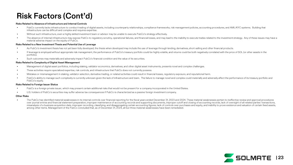 Risks Related to Absence of Infrastructure and Internal Controls • PubCo currently lacks infrastructure to conduct trading of digital assets, including counterparty relationships, compliance framewo rk s, risk management policies, accounting procedures, and AML/KYC systems. Building that infrastructure can be difficult and complex and requires expertise. • Without such infrastructure, even a highly skilled investment team or advisor may be unable to execute PubCo’s strategy effectively. • The absence of internal infrastructure may expose PubCo to regulatory scrutiny, operational failures, and financial losses, and may lead to the inability to execute trades related t o the investment strategy. Any of these issues may have a material adverse impact on the equity of PubCo . Risks Related to a New Investment Thesis and Potential Use of Leverage • As PubCo’s investment thesis has not yet been fully developed, the thesis when developed may include the use of leverage through lending , derivatives, short - selling and other financial products. • If leverage is employed without appropriate risk management, the performance of PubCo’s treasury portfolio could be highly volatile, and returns could be both negatively correlated with the price of SOL (or other as sets in the portfolio). • Such outcomes may materially and adversely impact PubCo’s financial condition and the value of its securities. Risks Related to Complexity of Digital Asset Management • Management of digital asset portfolios, including staking, validator economics, derivatives, and other digital asset instrume nts , presents novel and complex challenges. • These activities require specialized expertise, risk controls, and infrastructure that PubCo does not currently possess. • Mistakes or mismanagement in staking, validator selection, derivative trading, or related activities could result in financia l l osses, regulatory exposure, and reputational harm. • PubCo’s ability to manage such complexity is currently unknown given the lack of infrastructure and team. The failure to manage novel and complex could materially and adversely affect the performance of its treasury portfolio and PubCo’s equity. Risks Related to Foreign Issuer Status • PubCo is a foreign private issuer, which may present certain additional risks that would not be present for a company incorporated in the United States. • U.S. holders of PubCo's securities may suffer adverse tax consequences if PubCo is characterized as a passive foreign investment company. Other Risks • The PubCo has identified material weaknesses in its internal controls over financial reporting for the fiscal years ended December 31, 20 23 and 2024. These material weaknesses pertain to ineffective review and approval procedures over journal entries and financial statement preparation, improper maintenance of accounting records and supporting documents , i mproper cutoff and closing of accounting records, lack of oversight of all related parties' transactions, misanalysis of a business acquisition date, improper recording, classifying, and disaggregating certain accounting figures, l ack of controls over purchases and equity, and inability to prove existence and valuation of certain fixed assets, among other items. Management of the PubCo concluded that, as of December 31, 2024, all but three material weaknesses have been remediated. Risk Factors (Cont’d) | 23