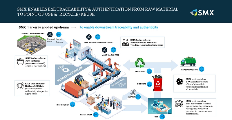 Leveraging patented sub-molecular marking, and using micro-GPS trackers and advanced blockchain encryption, the SMX technology is designed to ensure unprecedented traceability and security for electronic hardware, by integrating seamlessly into manufacturing processes and to enable full authentication.