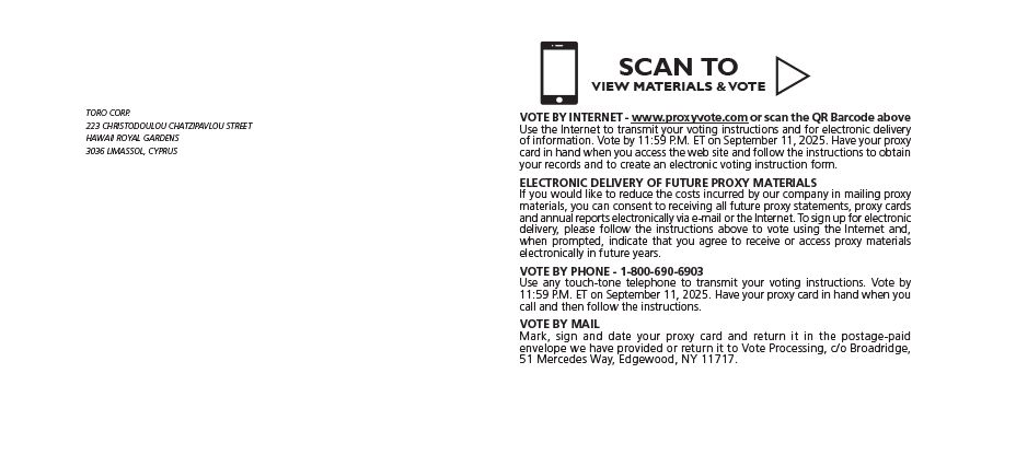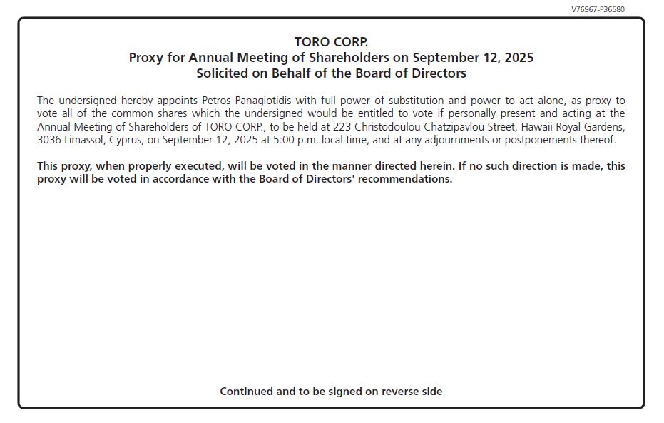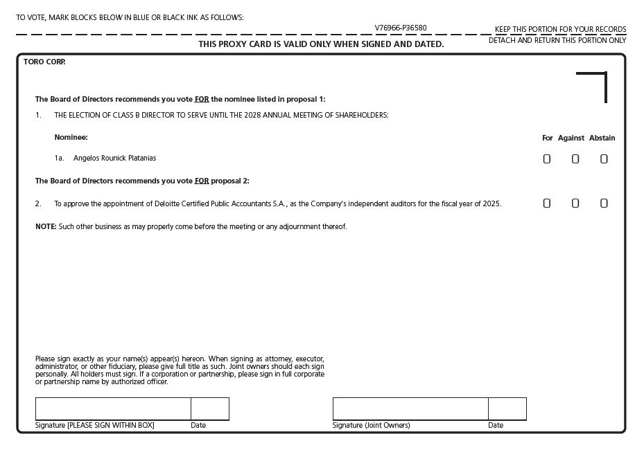 SCAN TO  VIEW MATERIALS & VOTE TORO CORP.  223 CHRISTODOULOU CHATZIPAVLOU STREET  HAWAII ROYAL GARDENS  3036 LIMASSOL, CYPRUS  VOTE BY INTERNET - www.proxyvote.com or scan the QR Barcode above  Use the Internet to transmit your voting instructions and for electronic delivery of information. Vote by 11:59 P.M. ET on September 11, 2025. Have your proxy card in hand when you access the web site and follow the instructions to obtain your records and to create an electronic voting instruction form.ELECTRONIC DELIVERY OF FUTURE PROXY MATERIALS  If you would like to reduce the costs incurred by our company in mailing proxy materials, you can consent to receiving all future proxy statements, proxy cards and annual reports electronically via e-mail or the Internet. To sign up for electronic delivery, please follow the instructions above to vote using the Internet and, when prompted, indicate that you agree to receive or access proxy materials electronically in future years.  VOTE BY PHONE - 1-800-690-6903  Use any touch-tone telephone to transmit your voting instructions. Vote by 11:59 P.M. ET on September 11, 2025. Have your proxy card in hand when you call and then follow the instructions.  VOTE BY MAIL  Mark, sign and date your proxy card and return it in the postage-paid envelope we have provided or return it to Vote Processing, c/o Broadridge, 51 Mercedes Way, Edgewood, NY 11717.TO VOTE, MARK BLOCKS BELOW IN BLUE OR BLACK INK AS FOLLOWS: V76966-P36580 KEEP THIS PORTION FOR YOUR RECORDS THIS PROXY CARD IS VALID ONLY WHEN SIGNED AND DATED. DETACH AND RETURN THIS PORTION ONLY TORO CORP. The Board of Directors recommends you vote FOR the nominee listed in proposal 1: 1. THE ELECTION OF CLASS B DIRECTOR TO SERVE UNTIL THE 2028 ANNUAL MEETING OF SHAREHOLDERS: Nominee: For Against Abstain   1a. Angelos Rounick Platanias ! ! ! The Board of Directors recommends you vote FOR proposal 2: 2. To approve the appointment of Deloitte Certified Public Accountants S.A., as the Company's independent auditors for the fiscal year of 2025. ! ! ! NOTE: Such other business as may properly come before the meeting or any adjournment thereof.   Please sign exactly as your name(s) appear(s) hereon. When signing as attorney, executor, administrator, or other fiduciary, please give full title as such. Joint owners should each sign personally. All holders must sign. If a corporation or partnership, please sign in full corporate or partnership name by authorized officer. Signature [PLEASE SIGN WITHIN BOX] Date Signature (Joint Owners) Date
