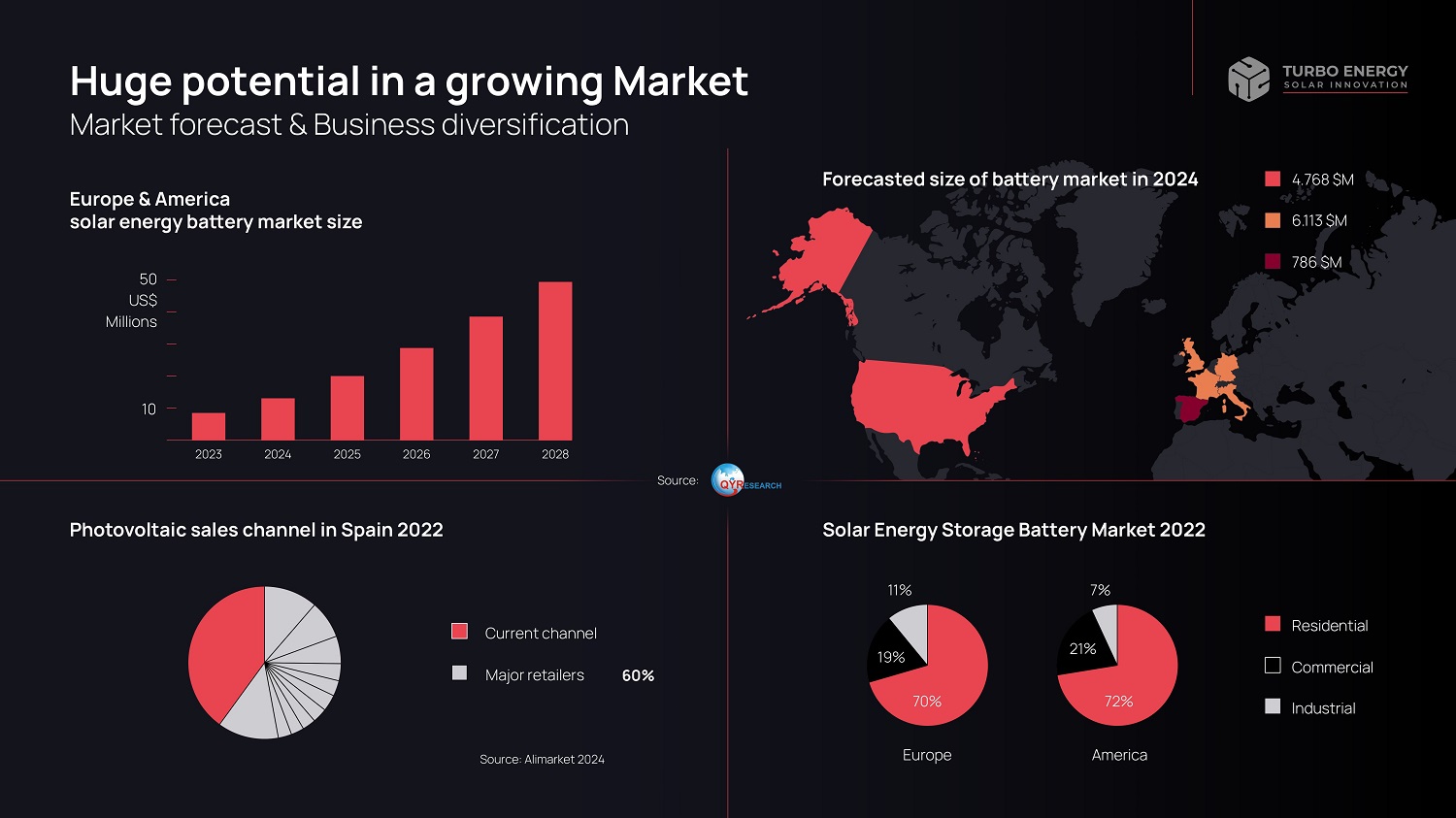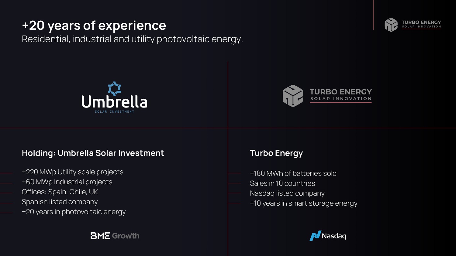 +20 years of experience Residential, industrial and utility photovoltaic energy. Holding: Umbrella Solar Investment +220 MWp Utility scale projects +60 MWp Industrial projects Offices: Spain, Chile, UK Spanish listed company +20 years in photovoltaic energy Turbo Energy +180 MWh of batteries sold Sales in 10 countries Nasdaq listed company +10 years in smart storage energy