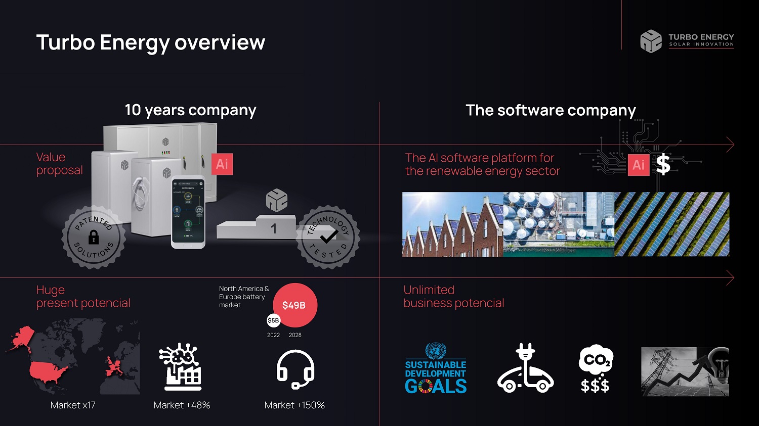 Turbo Energy overview Value proposal 10 years company Huge present potencial Unlimited business potencial Market x17 Market +48% Market +150% $49B North America & Europe battery market $5B 2022 2028 $ The AI software platform for the renewable energy sector The software company
