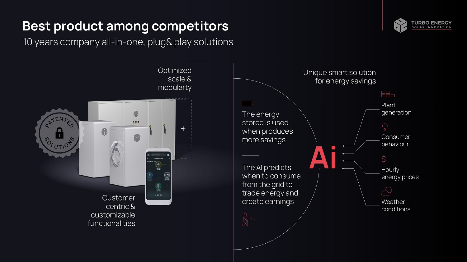 Customer centric & customizable functionalities The energy stored is used when produces more savings The AI predicts when to consume from the grid to trade energy and create earnings Plant generation Consumer behaviour Hourly energy prices Weather conditions Optimized scale & modularty Best product among competitors 10 years company all - in - one, plug& play solutions Unique smart solution for energy savings