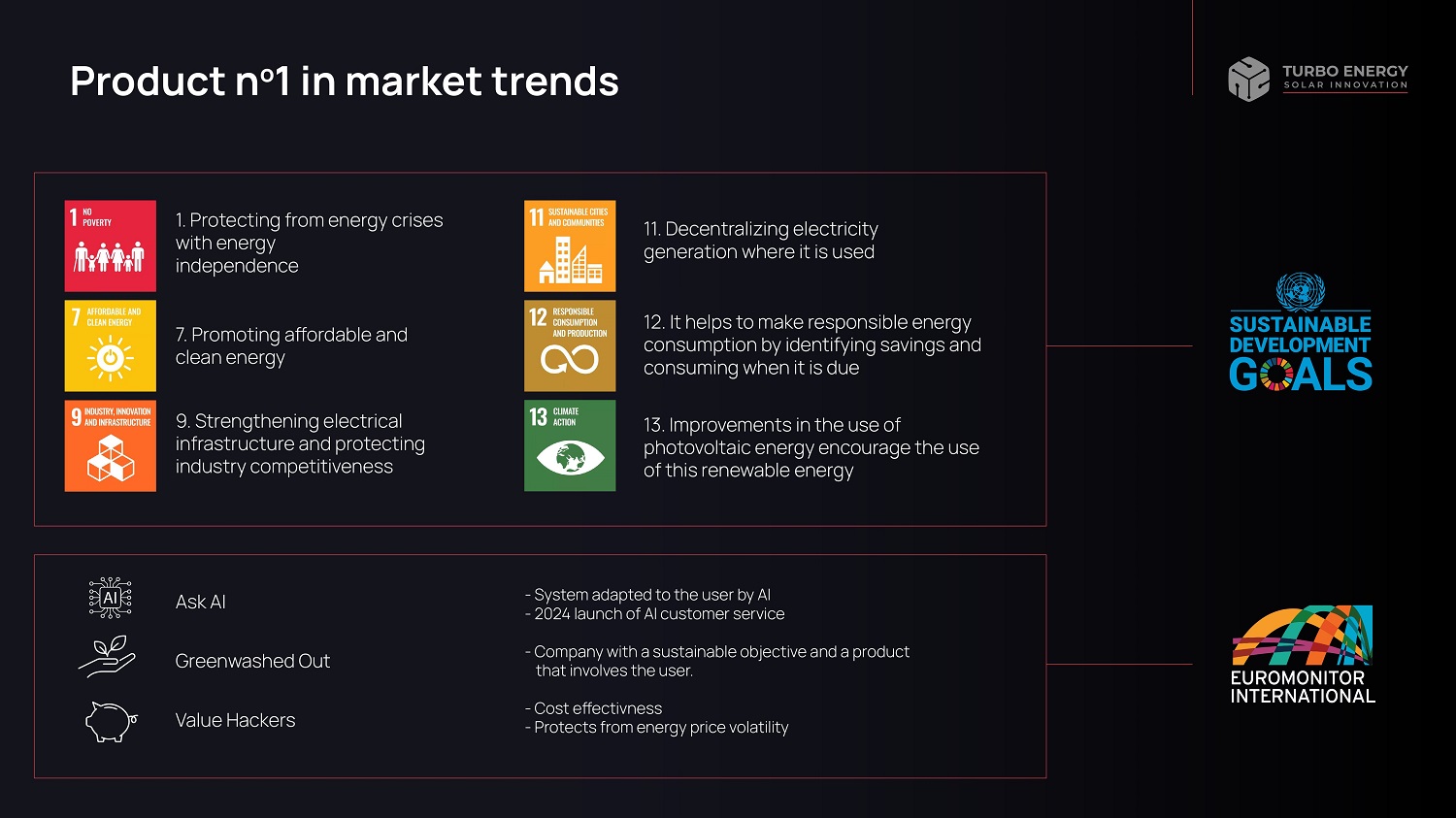Product n o 1 in market trends 1. Protecting from energy crises with energy independence - System adapted to the user by AI - 2024 launch of AI customer service - Company with a sustainable objective and a product that involves the user. - Cost effectivness - Protects from energy price volatility Ask AI Greenwashed Out Value Hackers 7. Promoting affordable and clean energy 9. Strengthening electrical infrastructure and protecting industry competitiveness 11. Decentralizing electricity generation where it is used 12. It helps to make responsible energy consumption by identifying savings and consuming when it is due 13. Improvements in the use of photovoltaic energy encourage the use of this renewable energy