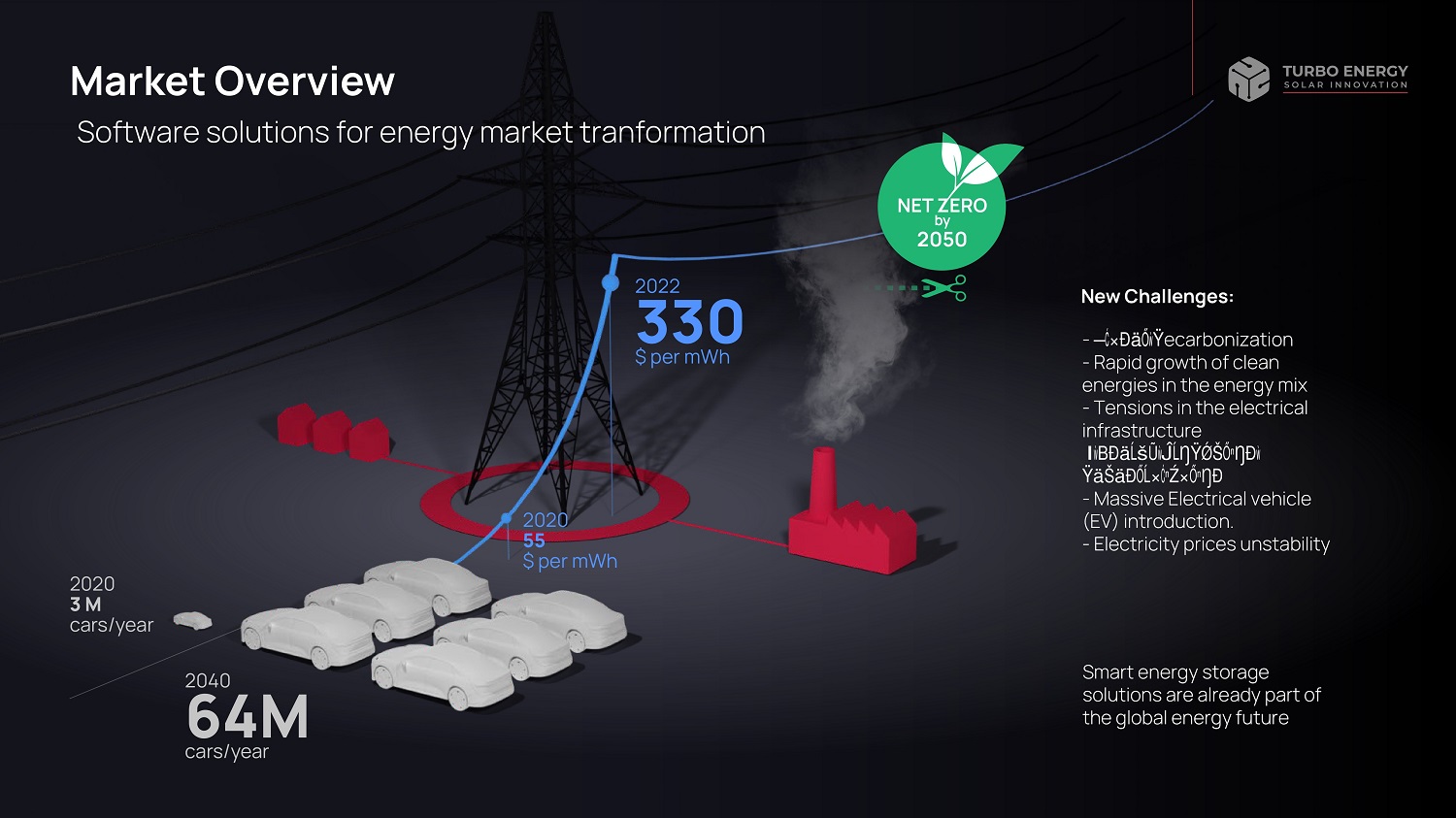 New Challenges: - ç₣∆ĆÈűџÂecarbonization - Rapid growth of clean energies in the energy mix - Tensions in the electrical infrastructure оџ@ĆÈŘ˝⌡џőŘ·ÂΓflűž·Ćџ ÂÈflÈĆűŘ∆₣ž┤∆űž·Ć - Massive Electrical vehicle (EV) introduction. - Electricity prices unstability Smart energy storage solutions are already part of the global energy future NET ZERO by 2050 2022 33 0 $ per mWh 2040 64M cars/year 2020 3 M cars/year 2020 55 $ per mWh Market Overview Software solutions for energy market tranformation