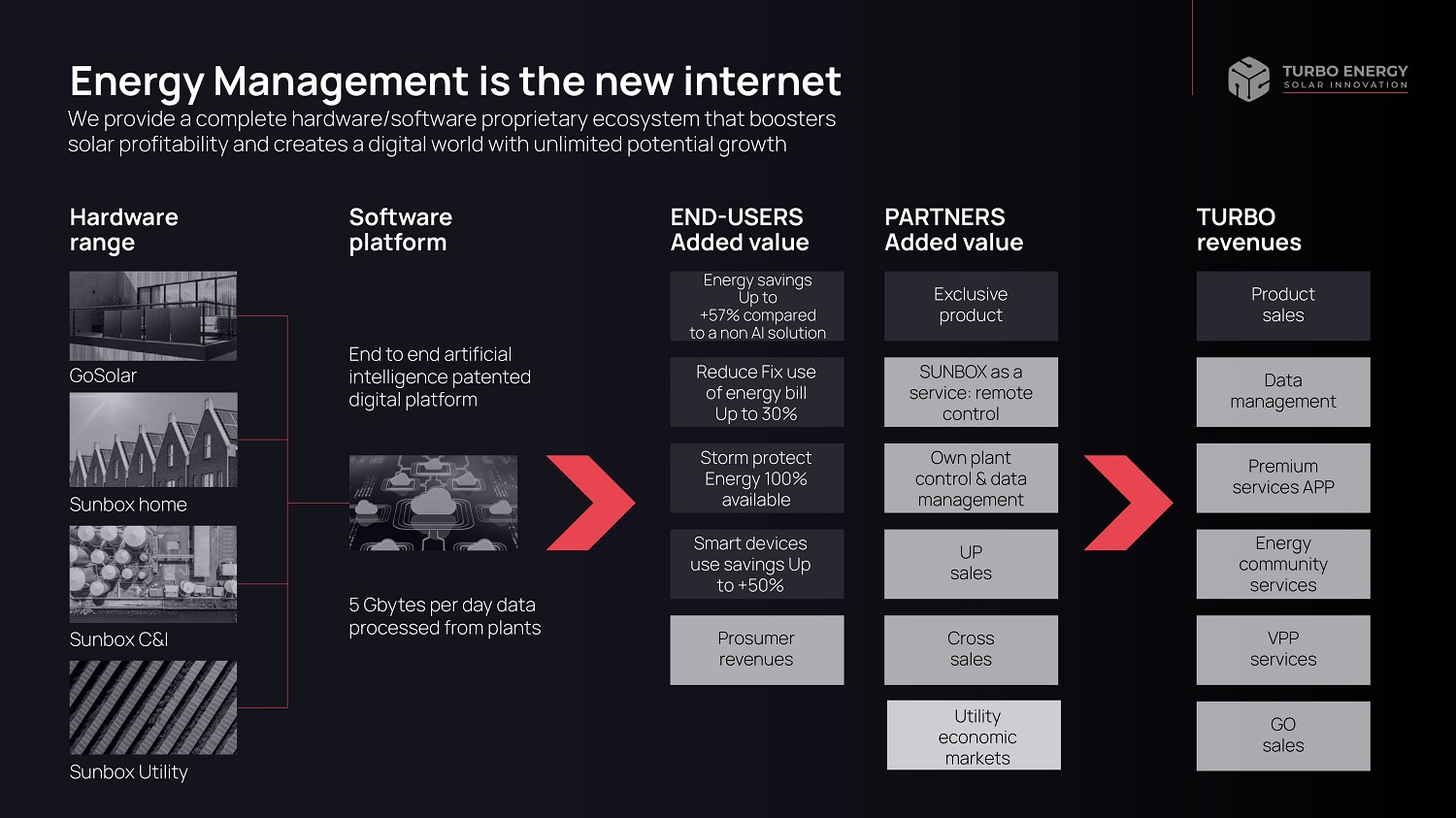 Hardware range Software platform PARTNERS Added value TURBO revenues Energy Management is the new internet We provide a complete hardware/software proprietary ecosystem that boosters solar profitability and creates a digital world with unlimited potential growth GoSolar Sunbox home Sunbox C&I Sunbox Utility End to end artificial intelligence patented digital platform 5 Gbytes per day data processed from plants Product sales Data management Energy community services VPP services Premium services APP GO sales Exclusive product SUNBOX as a service: remote control UP sales Cross sales Own plant control & data management END - USERS Added value Energy savings Up to +57% compared to a non AI solution Reduce Fix use of energy bill Up to 30% S mart devices use savings Up to +50% Prosumer revenues Storm protect Energy 100% available Utility economic markets
