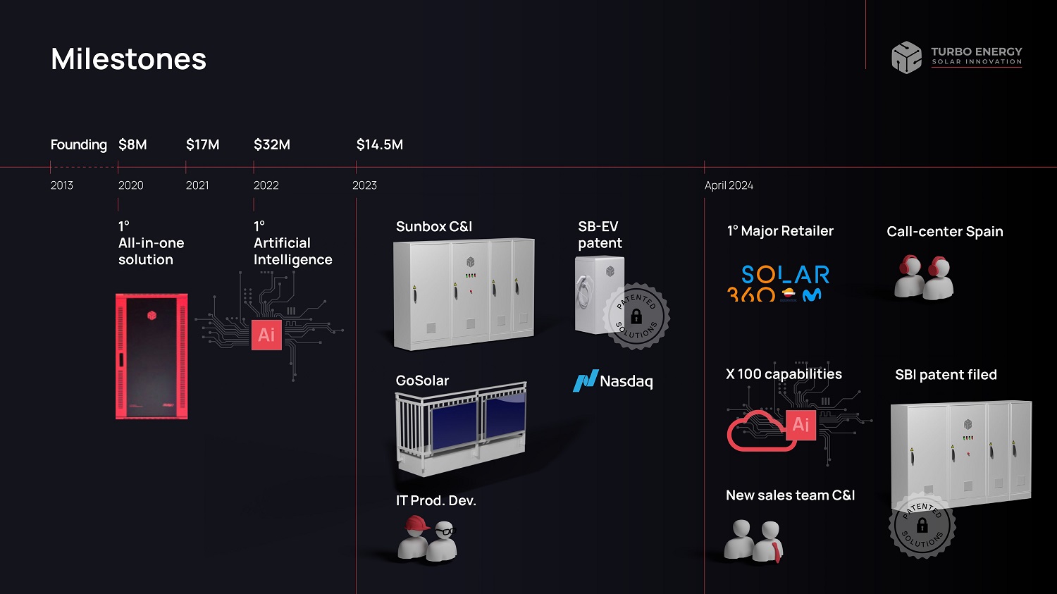 Milestones 2013 1 o All - in - one solution Founding $8M $17M $14.5M 2020 1 o Artificial Intelligence $32M Sunbox C&I 1 o Major Retailer GoSolar New sales team C&I 2021 2022 2023 April 2024 SB - EV patent SBI patent filed IT Prod. Dev. Call - center Spain X 100 capabilities