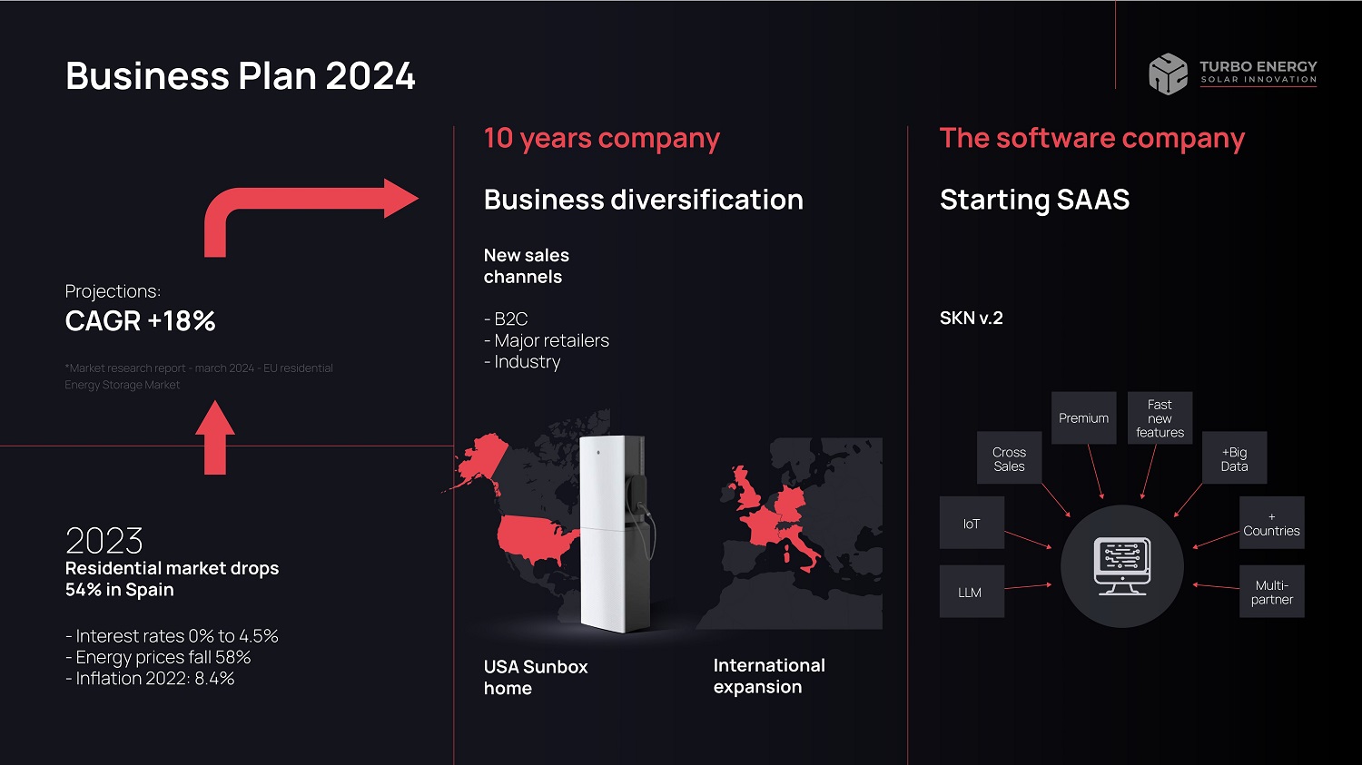 Business Plan 2024 2023 Residential market drops 54% in Spain - Interest rates 0% to 4.5% - Energy prices fall 58% - Inflation 2022: 8.4% Projections: CAGR +18% *Market research report - march 2024 - EU residential Energy Storage Market 10 years company Business diversification New sales channels - B2C - Major retailers - Industry International expansion USA Sunbox home The software company Starting SAAS SKN v.2 LLM IoT + Countries Multi - partner Cross Sales +Big Data Premium Fast new features