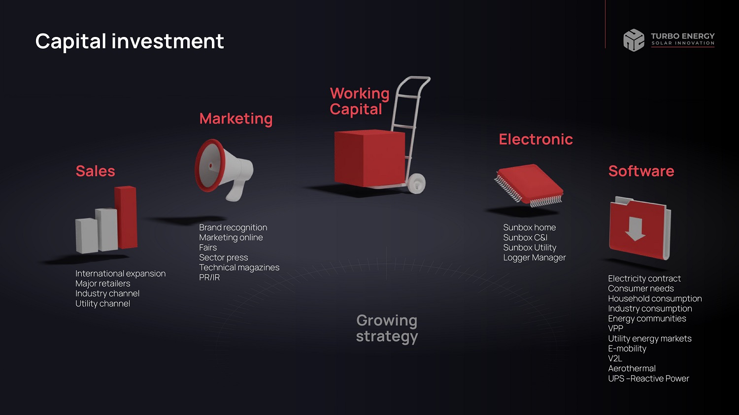 Capital investment International expansion Major retailers Industry channel Utility channel Brand recognition Marketing online Fairs Sector press Technical magazines PR/IR Sunbox home Sunbox C&I Sunbox Utility Logger Manager Electricity contract Consumer needs Household consumption Industry consumption Energy communities VPP Utility energy markets E - mobility V2L Aerothermal UPS – Reactive Power Sales Software Marketing Growing strategy Electronic Working Capital