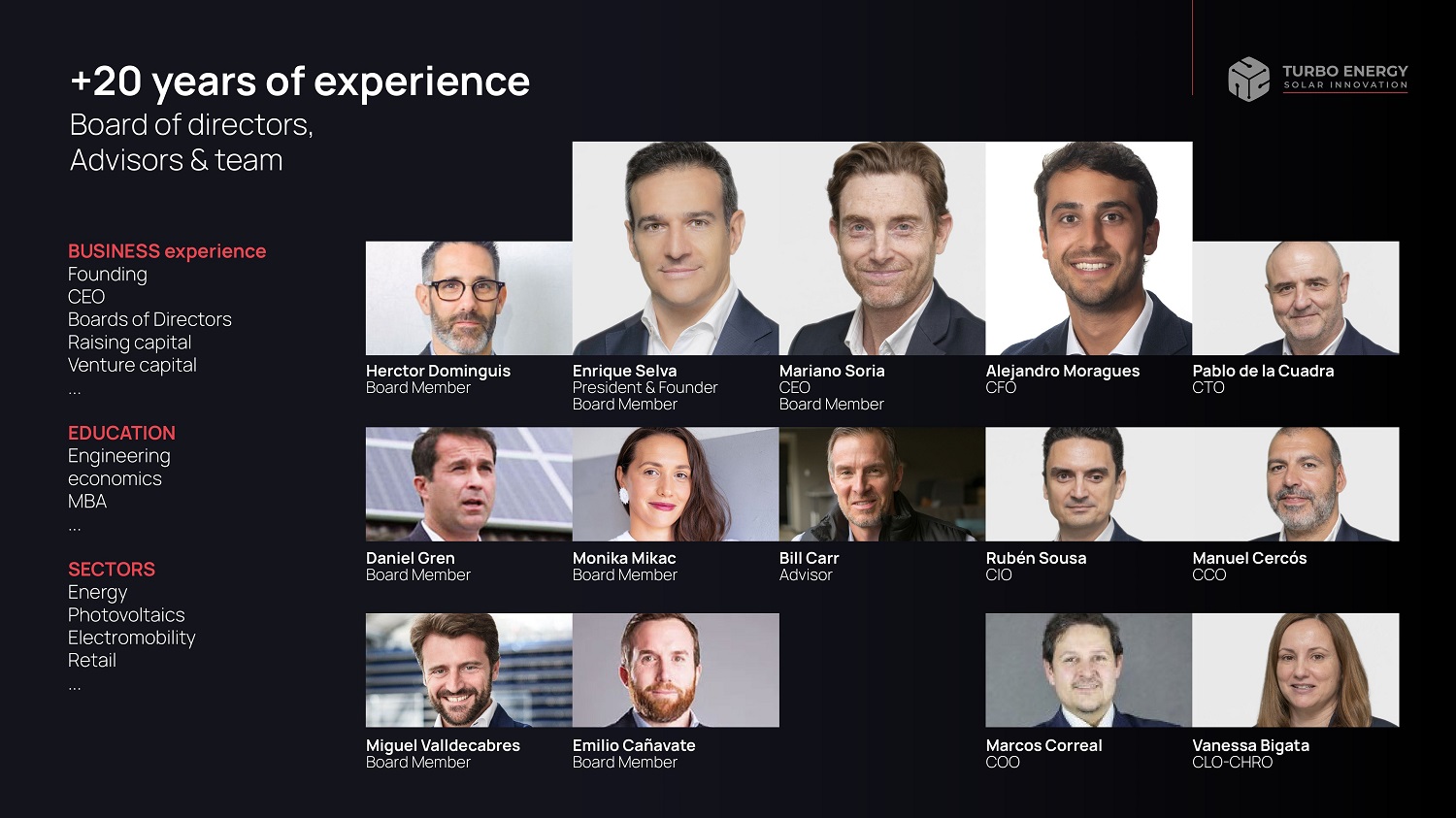 +20 years of experience Board of directors, Advisors & team BUSINESS experience Founding CEO Boards of Directors Raising capital Venture capital ... EDUCATION Engineering economics MBA ... SECTORS Energy Photovoltaics Electromobility Retail ... Herctor Dominguis Board Member Enrique Selva President & Founder Board Member Mariano Soria CEO Board Member Alejandro Moragues CFO Pablo de la Cuadra CTO Daniel Gren Board Member Monika Mikac Board Member Bill Carr Advisor Rubén Sousa CIO Manuel Cercós CCO Miguel Valldecabres Board Member Emilio Cañavate Board Member Marcos Correal COO Vanessa Bigata CLO - CHRO