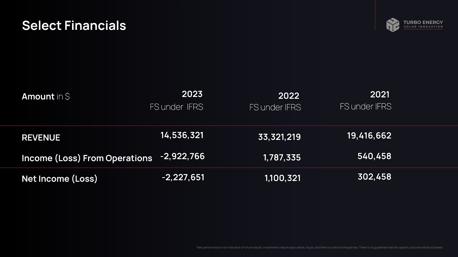 Select Financials Amount in $ REVENUE Income (Loss) From Operations Net Income (Loss) 2022 FS under IFRS 33,321,219 1,787,335 1,100,321 2021 FS under IFRS 19,416,662 540,458 302,458 2023 FS under IFRS 14,536,321 - 2,922,766 - 2,227,651 Past performance is not indicative of future results. Investments may be speculative, iliquid, and there is a risk of principal loss. There is no guarantee that any specific outcome will be achieved.