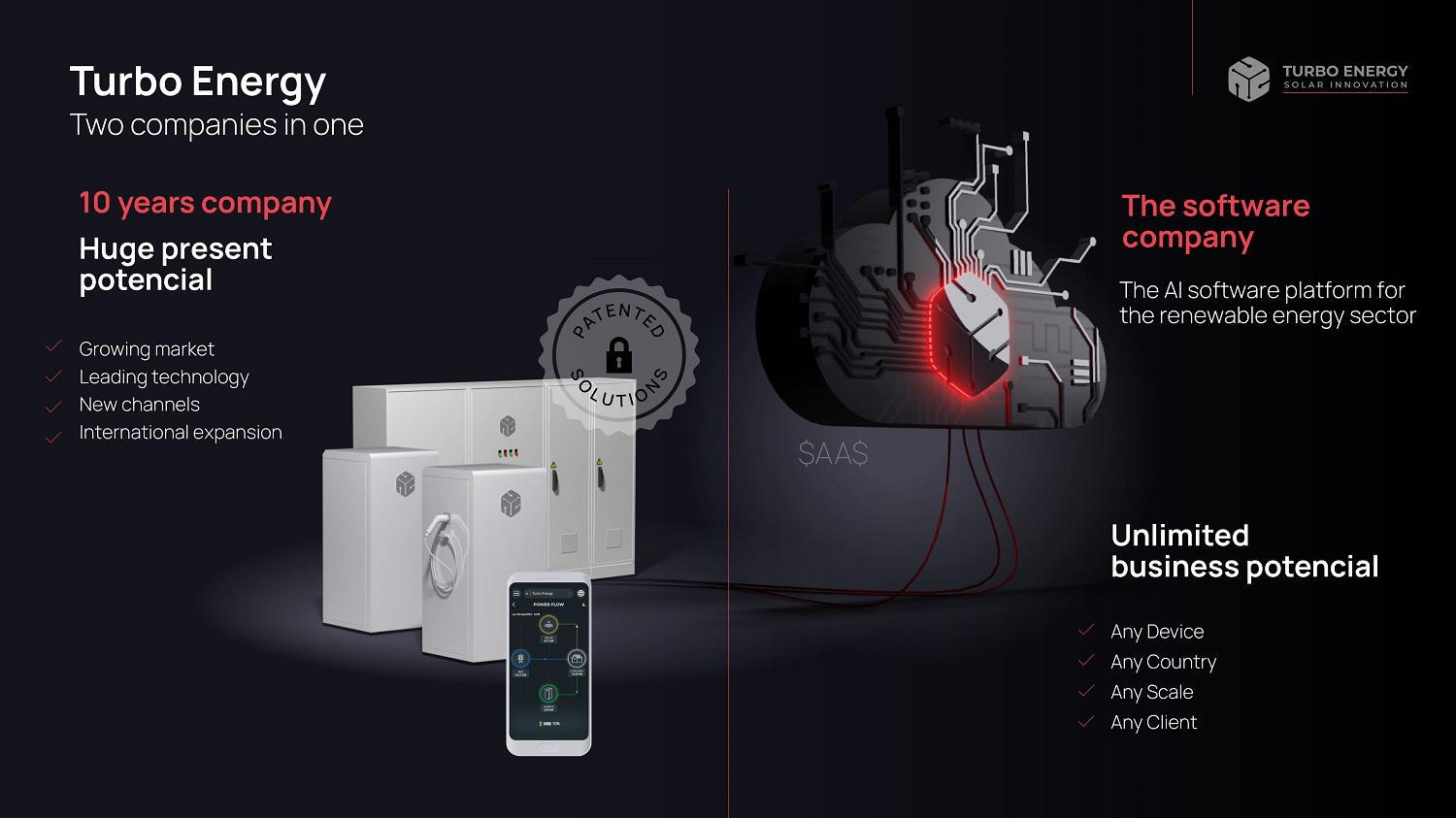 10 years company Huge present potencial Growing market Leading technology New channels International expansion Unlimited business potencial Any Device Any Country Any Scale Any Client Turbo Energy Two companies in one $AA$ The software company The AI software platform for the renewable energy sector