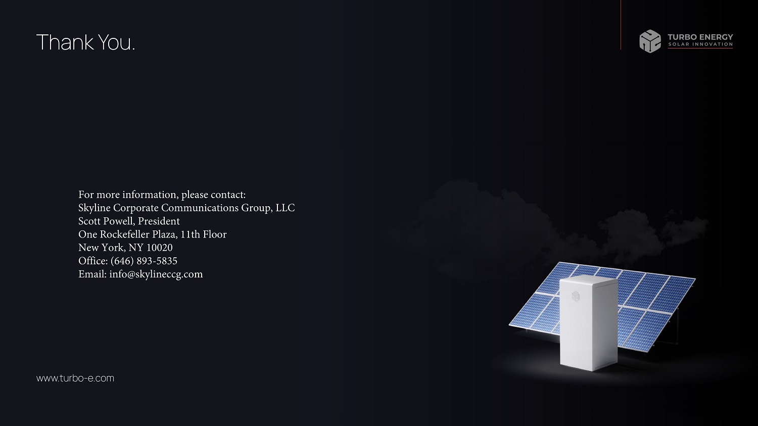 Thank You. www.turbo - e.com For more information, please contact: Skyline Corporate Communications Group, LLC Scott Powell, President One Rockefeller Plaza, 11th Floor New York, NY 10020 Office: (646) 893 - 5835 Email: info@skylineccg.com