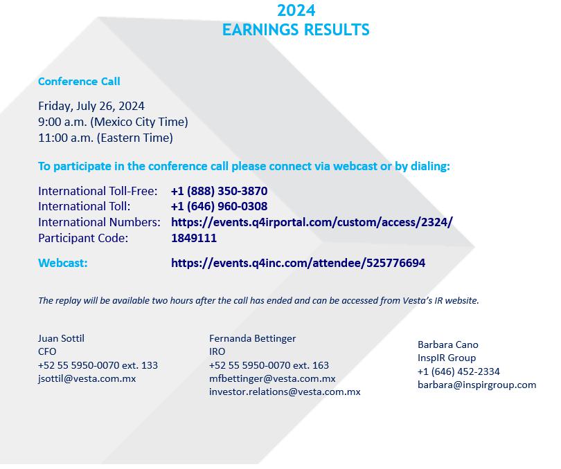 Mexico City, July 25, 2024 – Corporación Inmobiliaria Vesta S.A.B. de C.V., (“Vesta”, or the “Company”) (BMV: VESTA; NYSE: VTMX), a leading industrial real estate company in Mexico, today announced results for the second quarter ended June 30, 2024. All figures included herein were prepared in accordance with International Financial Reporting Standards (IFRS), which differs in certain significant respects from U.S. GAAP. This information should be read in conjunction with, and is qualified in its entirety by reference to, our consolidated financial statements, including the notes thereto. Vesta’s financial results are stated in US dollars unless otherwise noted.