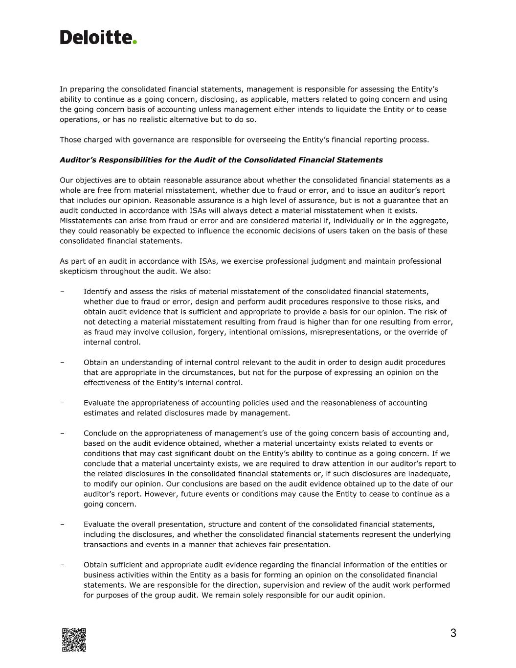 3 In preparing the consolidated financial statements, management is responsible for assessing the Entity’s ability to continue as a going concern, disclosing, as applicable, matters related to going concern and using the going concern basis of accounting unless management either intends to liquidate the Entity or to cease operations, or has no realistic alternative but to do so. Those charged with governance are responsible for overseeing the Entity’s financial reporting process. Auditor’s Responsibilities for the Audit of the Consolidated Financial Statements Our objectives are to obtain reasonable assurance about whether the consolidated financial statements as a whole are free from material misstatement, whether due to fraud or error, and to issue an auditor’s report that includes our opinion. Reasonable assurance is a high level of assurance, but is not a guarantee that an audit conducted in accordance with ISAs will always detect a material misstatement when it exists. Misstatements can arise from fraud or error and are considered material if, individually or in the aggregate, they could reasonably be expected to influence the economic decisions of users taken on the basis of these consolidated financial statements. As part of an audit in accordance with ISAs, we exercise professional judgment and maintain professional skepticism throughout the audit. We also: ­ Identify and assess the risks of material misstatement of the consolidated financial statements, whether due to fraud or error, design and perform audit procedures responsive to those risks, and obtain audit evidence that is sufficient and appropriate to provide a basis for our opinion. The risk of not detecting a material misstatement resulting from fraud is higher than for one resulting from error, as fraud may involve collusion, forgery, intentional omissions, misrepresentations, or the override of internal control. ­ Obtain an understanding of internal control relevant to the audit in order to design audit procedures that are appropriate in the circumstances, but not for the purpose of expressing an opinion on the effectiveness of the Entity’s internal control. ­ Evaluate the appropriateness of accounting policies used and the reasonableness of accounting estimates and related disclosures made by management. ­ Conclude on the appropriateness of management’s use of the going concern basis of accounting and, based on the audit evidence obtained, whether a material uncertainty exists related to events or conditions that may cast significant doubt on the Entity’s ability to continue as a going concern. If we conclude that a material uncertainty exists, we are required to draw attention in our auditor’s report to the related disclosures in the consolidated financial statements or, if such disclosures are inadequate, to modify our opinion. Our conclusions are based on the audit evidence obtained up to the date of our auditor’s report. However, future events or conditions may cause the Entity to cease to continue as a going concern. ­ Evaluate the overall presentation, structure and content of the consolidated financial statements, including the disclosures, and whether the consolidated financial statements represent the underlying transactions and events in a manner that achieves fair presentation. ­ Obtain sufficient and appropriate audit evidence regarding the financial information of the entities or business activities within the Entity as a basis for forming an opinion on the consolidated financial statements. We are responsible for the direction, supervision and review of the audit work performed for purposes of the group audit. We remain solely responsible for our audit opinion. Deloitte.