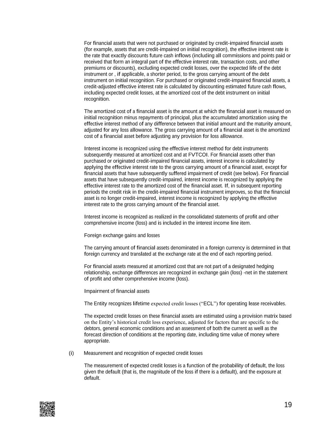 19 For financial assets that were not purchased or originated by credit-impaired financial assets (for example, assets that are credit-impaired on initial recognition), the effective interest rate is the rate that exactly discounts future cash inflows (including all commissions and points paid or received that form an integral part of the effective interest rate, transaction costs, and other premiums or discounts), excluding expected credit losses, over the expected life of the debt instrument or , if applicable, a shorter period, to the gross carrying amount of the debt instrument on initial recognition. For purchased or originated credit-impaired financial assets, a credit-adjusted effective interest rate is calculated by discounting estimated future cash flows, including expected credit losses, at the amortized cost of the debt instrument on initial recognition. The amortized cost of a financial asset is the amount at which the financial asset is measured on initial recognition minus repayments of principal, plus the accumulated amortization using the effective interest method of any difference between that initial amount and the maturity amount, adjusted for any loss allowance. The gross carrying amount of a financial asset is the amortized cost of a financial asset before adjusting any provision for loss allowance. Interest income is recognized using the effective interest method for debt instruments subsequently measured at amortized cost and at FVTCOI. For financial assets other than purchased or originated credit-impaired financial assets, interest income is calculated by applying the effective interest rate to the gross carrying amount of a financial asset, except for financial assets that have subsequently suffered impairment of credit (see below). For financial assets that have subsequently credit-impaired, interest income is recognized by applying the effective interest rate to the amortized cost of the financial asset. If, in subsequent reporting periods the credit risk in the credit-impaired financial instrument improves, so that the financial asset is no longer credit-impaired, interest income is recognized by applying the effective interest rate to the gross carrying amount of the financial asset. Interest income is recognized as realized in the consolidated statements of profit and other comprehensive income (loss) and is included in the interest income line item. Foreign exchange gains and losses The carrying amount of financial assets denominated in a foreign currency is determined in that foreign currency and translated at the exchange rate at the end of each reporting period. For financial assets measured at amortized cost that are not part of a designated hedging relationship, exchange differences are recognized in exchange gain (loss) -net in the statement of profit and other comprehensive income (loss). Impairment of financial assets The Entity recognizes lifetime expected credit losses (“ECL”) for operating lease receivables. The expected credit losses on these financial assets are estimated using a provision matrix based on the Entity’s historical credit loss experience, adjusted for factors that are specific to the debtors, general economic conditions and an assessment of both the current as well as the forecast direction of conditions at the reporting date, including time value of money where appropriate. (i) Measurement and recognition of expected credit losses The measurement of expected credit losses is a function of the probability of default, the loss given the default (that is, the magnitude of the loss if there is a default), and the exposure at default.