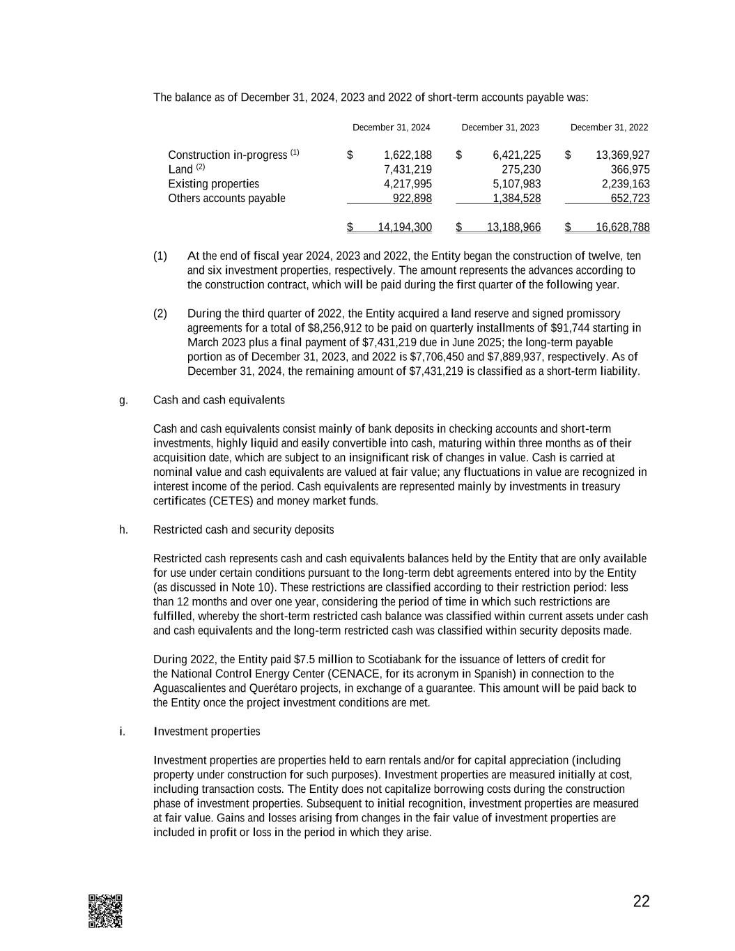 22 The balance as of December 31, 2024, 2023 and 2022 of short-term accounts payable was: December 31, 2024 December 31, 2023 December 31, 2022 Construction in-progress (1) $ 1,622,188 $ 6,421,225 $ 13,369,927 Land (2) 7,431,219 275,230 366,975 Existing properties 4,217,995 5,107,983 2,239,163 Others accounts payable 922,898 1,384,528 652,723 $ 14,194,300 $ 13,188,966 $ 16,628,788 (1) At the end of fiscal year 2024, 2023 and 2022, the Entity began the construction of twelve, ten and six investment properties, respectively. The amount represents the advances according to the construction contract, which will be paid during the first quarter of the following year. (2) During the third quarter of 2022, the Entity acquired a land reserve and signed promissory agreements for a total of $8,256,912 to be paid on quarterly installments of $91,744 starting in March 2023 plus a final payment of $7,431,219 due in June 2025; the long-term payable portion as of December 31, 2023, and 2022 is $7,706,450 and $7,889,937, respectively. As of December 31, 2024, the remaining amount of $7,431,219 is classified as a short-term liability. g. Cash and cash equivalents Cash and cash equivalents consist mainly of bank deposits in checking accounts and short-term investments, highly liquid and easily convertible into cash, maturing within three months as of their acquisition date, which are subject to an insignificant risk of changes in value. Cash is carried at nominal value and cash equivalents are valued at fair value; any fluctuations in value are recognized in interest income of the period. Cash equivalents are represented mainly by investments in treasury certificates (CETES) and money market funds. h. Restricted cash and security deposits Restricted cash represents cash and cash equivalents balances held by the Entity that are only available for use under certain conditions pursuant to the long-term debt agreements entered into by the Entity (as discussed in Note 10). These restrictions are classified according to their restriction period: less than 12 months and over one year, considering the period of time in which such restrictions are fulfilled, whereby the short-term restricted cash balance was classified within current assets under cash and cash equivalents and the long-term restricted cash was classified within security deposits made. During 2022, the Entity paid $7.5 million to Scotiabank for the issuance of letters of credit for the National Control Energy Center (CENACE, for its acronym in Spanish) in connection to the Aguascalientes and Querétaro projects, in exchange of a guarantee. This amount will be paid back to the Entity once the project investment conditions are met. i. Investment properties Investment properties are properties held to earn rentals and/or for capital appreciation (including property under construction for such purposes). Investment properties are measured initially at cost, including transaction costs. The Entity does not capitalize borrowing costs during the construction phase of investment properties. Subsequent to initial recognition, investment properties are measured at fair value. Gains and losses arising from changes in the fair value of investment properties are included in profit or loss in the period in which they arise.