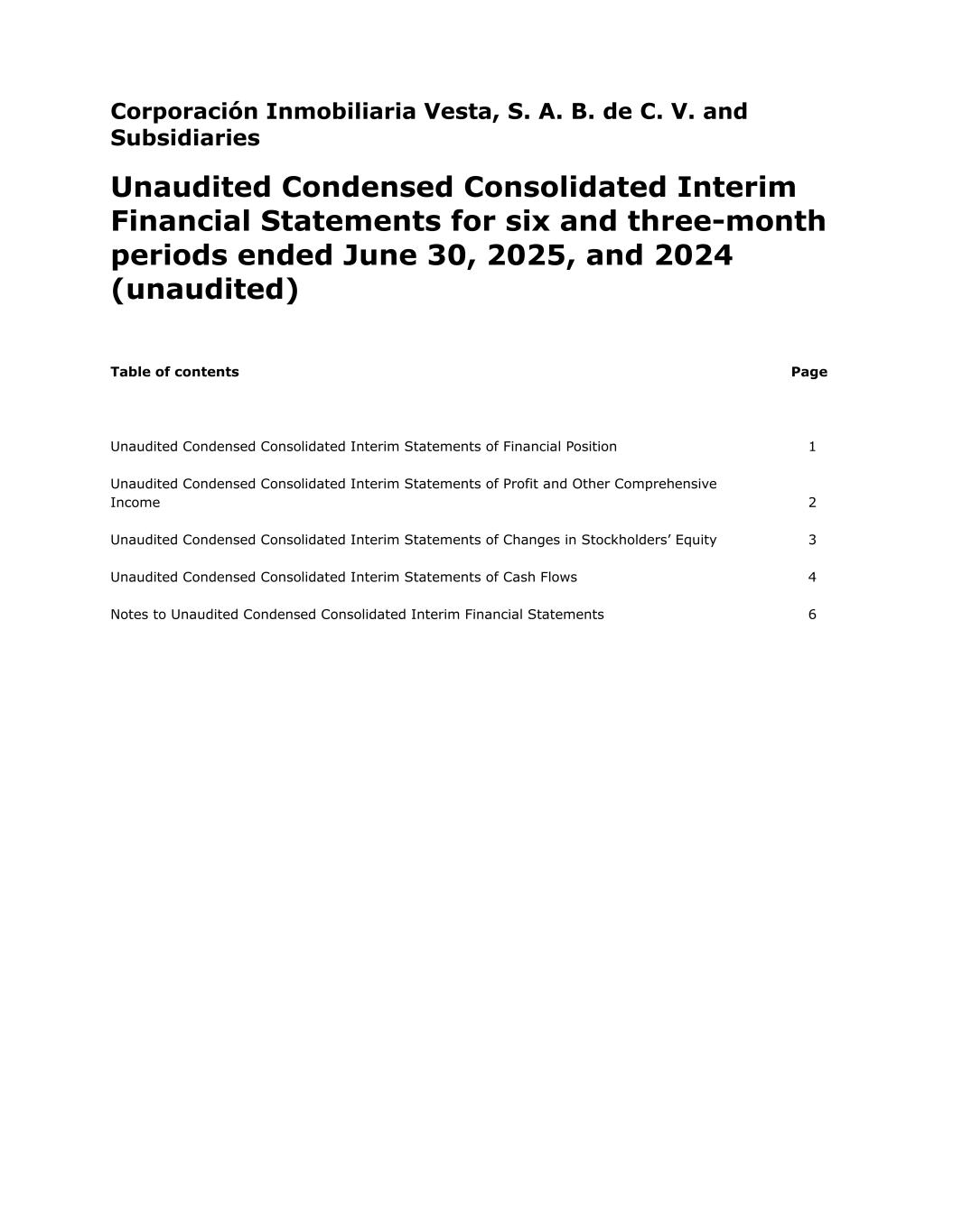 Corporación Inmobiliaria Vesta, S. A. B. de C. V. and Subsidiaries Unaudited Condensed Consolidated Interim Financial Statements for six and three-month periods ended June 30, 2025, and 2024 (unaudited) Table of contents Page Unaudited Condensed Consolidated Interim Statements of Financial Position 1 Unaudited Condensed Consolidated Interim Statements of Profit and Other Comprehensive Income 2 Unaudited Condensed Consolidated Interim Statements of Changes in Stockholders’ Equity 3 Unaudited Condensed Consolidated Interim Statements of Cash Flows 4 Notes to Unaudited Condensed Consolidated Interim Financial Statements 6