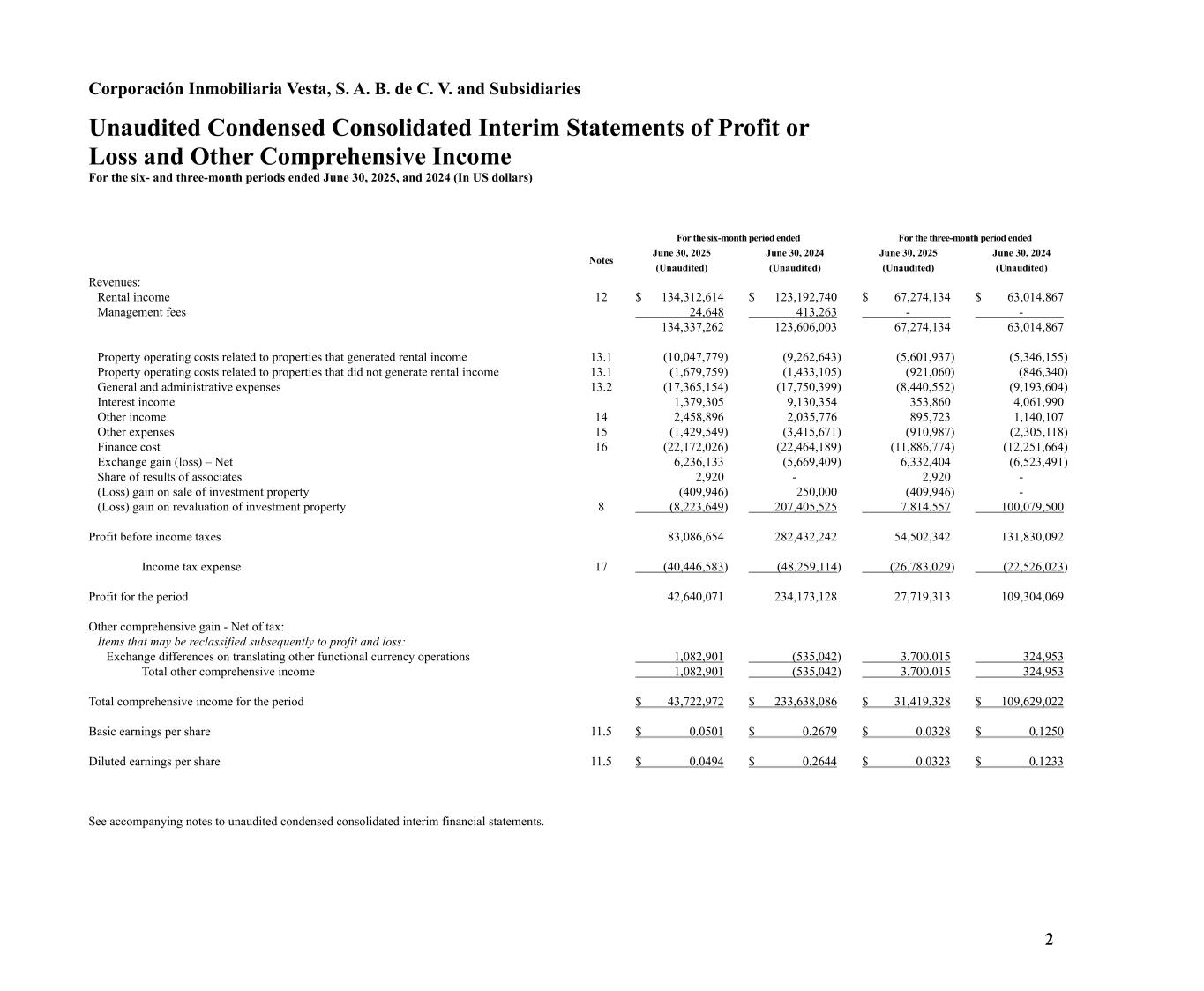 2 Corporación Inmobiliaria Vesta, S. A. B. de C. V. and Subsidiaries Unaudited Condensed Consolidated Interim Statements of Profit or Loss and Other Comprehensive Income For the six- and three-month periods ended June 30, 2025, and 2024 (In US dollars) For the six-month period ended For the three-month period ended Notes June 30, 2025 (Unaudited) June 30, 2024 (Unaudited) June 30, 2025 (Unaudited) June 30, 2024 (Unaudited) Revenues: Rental income 12 $ 134,312,614 $ 123,192,740 $ 67,274,134 $ 63,014,867 Management fees 24,648 413,263 - - 134,337,262 123,606,003 67,274,134 63,014,867 Property operating costs related to properties that generated rental income 13.1 (10,047,779) (9,262,643) (5,601,937) (5,346,155) Property operating costs related to properties that did not generate rental income 13.1 (1,679,759) (1,433,105) (921,060) (846,340) General and administrative expenses 13.2 (17,365,154) (17,750,399) (8,440,552) (9,193,604) Interest income 1,379,305 9,130,354 353,860 4,061,990 Other income 14 2,458,896 2,035,776 895,723 1,140,107 Other expenses 15 (1,429,549) (3,415,671) (910,987) (2,305,118) Finance cost 16 (22,172,026) (22,464,189) (11,886,774) (12,251,664) Exchange gain (loss) – Net 6,236,133 (5,669,409) 6,332,404 (6,523,491) Share of results of associates 2,920 - 2,920 - (Loss) gain on sale of investment property (409,946) 250,000 (409,946) - (Loss) gain on revaluation of investment property 8 (8,223,649) 207,405,525 7,814,557 100,079,500 Profit before income taxes 83,086,654 282,432,242 54,502,342 131,830,092 Income tax expense 17 (40,446,583) (48,259,114) (26,783,029) (22,526,023) Profit for the period 42,640,071 234,173,128 27,719,313 109,304,069 Other comprehensive gain - Net of tax: Items that may be reclassified subsequently to profit and loss: Exchange differences on translating other functional currency operations 1,082,901 (535,042) 3,700,015 324,953 Total other comprehensive income 1,082,901 (535,042) 3,700,015 324,953 Total comprehensive income for the period $ 43,722,972 $ 233,638,086 $ 31,419,328 $ 109,629,022 Basic earnings per share 11.5 $ 0.0501 $ 0.2679 $ 0.0328 $ 0.1250 Diluted earnings per share 11.5 $ 0.0494 $ 0.2644 $ 0.0323 $ 0.1233 See accompanying notes to unaudited condensed consolidated interim financial statements.
