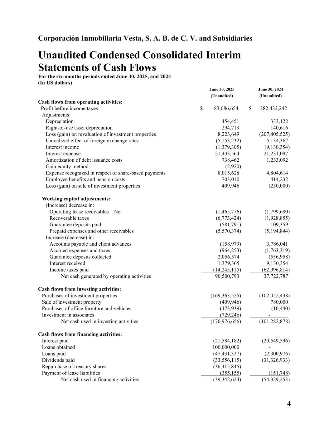 4 Corporación Inmobiliaria Vesta, S. A. B. de C. V. and Subsidiaries Unaudited Condensed Consolidated Interim Statements of Cash Flows For the six-months periods ended June 30, 2025, and 2024 (In US dollars) June 30, 2025 (Unaudited) June 30, 2024 (Unaudited) Cash flows from operating activities: Profit before income taxes $ 83,086,654 $ 282,432,242 Adjustments: Depreciation 454,451 333,122 Right-of-use asset depreciation 294,719 140,616 Loss (gain) on revaluation of investment properties 8,223,649 (207,405,525) Unrealized effect of foreign exchange rates (5,153,232) 5,134,367 Interest income (1,379,305) (9,130,354) Interest expense 21,433,564 21,231,097 Amortization of debt issuance costs 738,462 1,233,092 Gain equity method (2,920) - Expense recognized in respect of share-based payments 8,015,628 4,804,614 Employee benefits and pension costs 703,010 414,232 Loss (gain) on sale of investment properties 409,946 (250,000) Working capital adjustments: (Increase) decrease in: Operating lease receivables – Net (1,465,776) (1,799,680) Recoverable taxes (6,773,424) (1,928,855) Guarantee deposits paid (581,791) 109,359 Prepaid expenses and other receivables (5,570,374) (5,194,844) Increase (decrease) in: Accounts payable and client advances (158,979) 3,786,041 Accrued expenses and taxes (964,253) (1,763,319) Guarantee deposits collected 2,056,574 (556,958) Interest received 1,379,305 9,130,354 Income taxes paid (14,245,115) (62,996,814) Net cash generated by operating activities 90,500,793 37,722,787 Cash flows from investing activities: Purchases of investment properties (169,363,525) (102,052,438) Sale of investment property (409,946) 780,000 Purchases of office furniture and vehicles (473,939) (10,440) Investment in associates (729,246) - Net cash used in investing activities (170,976,656) (101,282,878) Cash flows from financing activities: Interest paid (21,584,182) (20,549,596) Loans obtained 100,000,000 - Loans paid (47,431,327) (2,300,976) Dividends paid (33,556,115) (31,326,933) Repurchase of treasury shares (36,415,845) - Payment of lease liabilities (355,155) (151,748) Net cash used in financing activities (39,342,624) (54,329,253)