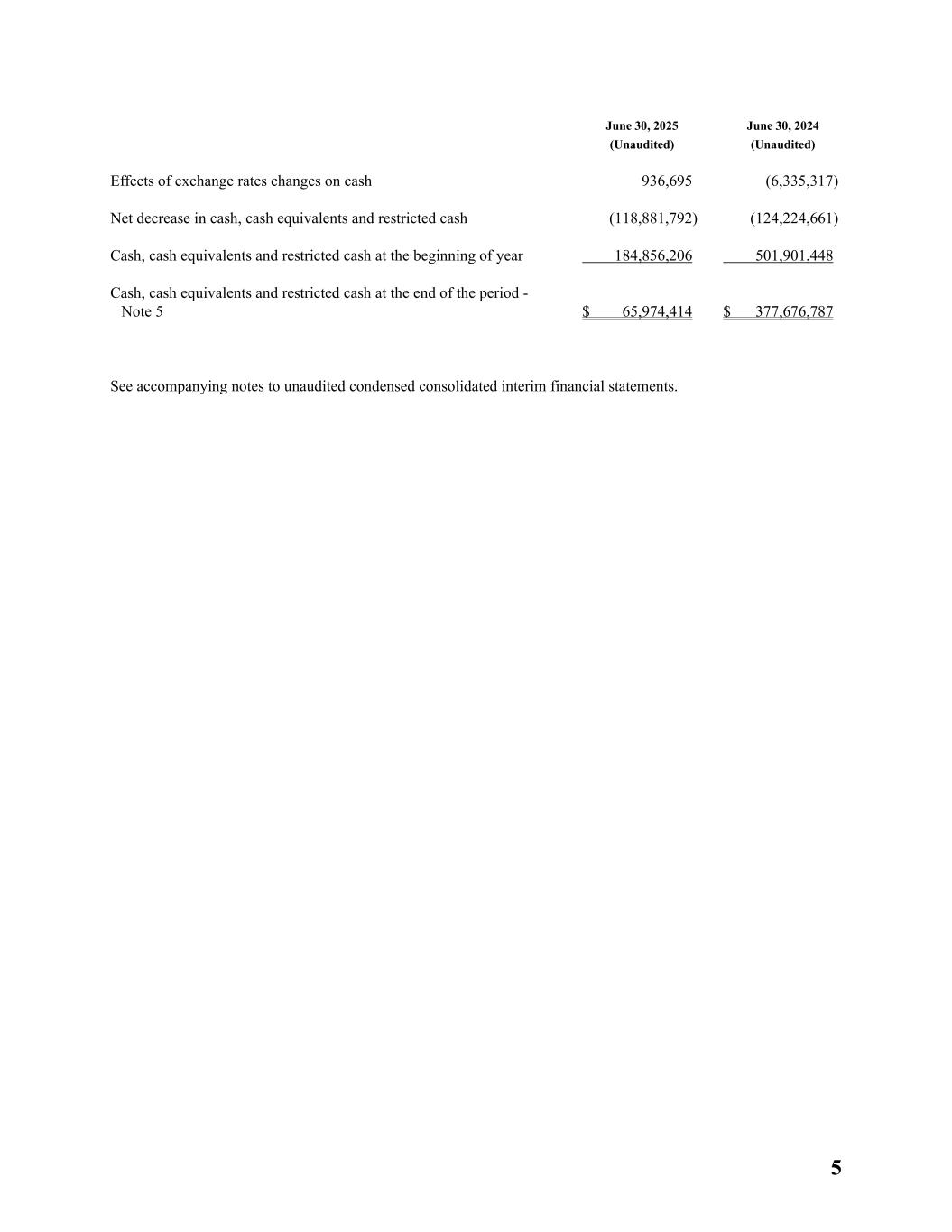 5 June 30, 2025 (Unaudited) June 30, 2024 (Unaudited) Effects of exchange rates changes on cash 936,695 (6,335,317) Net decrease in cash, cash equivalents and restricted cash (118,881,792) (124,224,661) Cash, cash equivalents and restricted cash at the beginning of year 184,856,206 501,901,448 Cash, cash equivalents and restricted cash at the end of the period - Note 5 $ 65,974,414 $ 377,676,787 See accompanying notes to unaudited condensed consolidated interim financial statements.