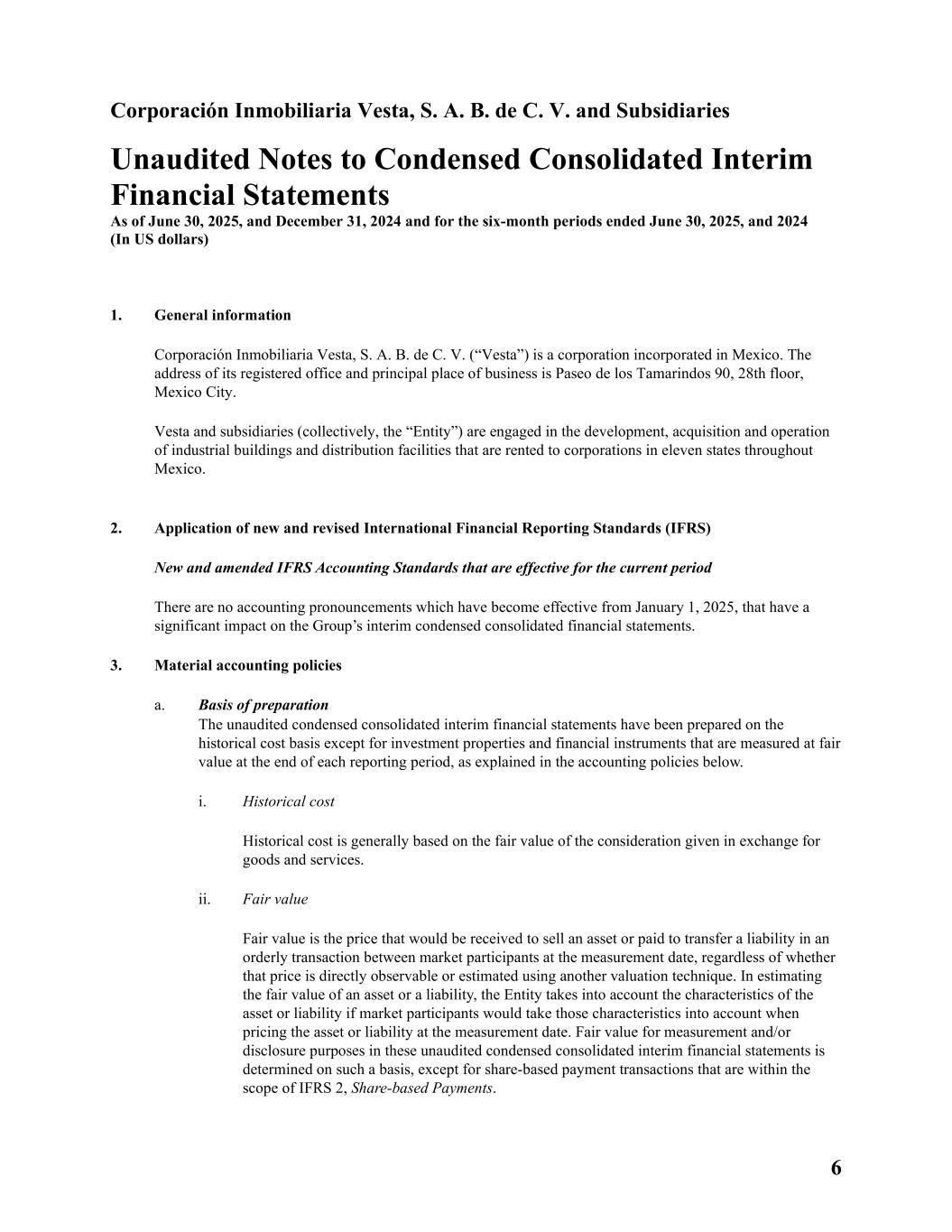 6 Corporación Inmobiliaria Vesta, S. A. B. de C. V. and Subsidiaries Unaudited Notes to Condensed Consolidated Interim Financial Statements As of June 30, 2025, and December 31, 2024 and for the six-month periods ended June 30, 2025, and 2024 (In US dollars) 1. General information Corporación Inmobiliaria Vesta, S. A. B. de C. V. (“Vesta”) is a corporation incorporated in Mexico. The address of its registered office and principal place of business is Paseo de los Tamarindos 90, 28th floor, Mexico City. Vesta and subsidiaries (collectively, the “Entity”) are engaged in the development, acquisition and operation of industrial buildings and distribution facilities that are rented to corporations in eleven states throughout Mexico. 2. Application of new and revised International Financial Reporting Standards (IFRS) New and amended IFRS Accounting Standards that are effective for the current period There are no accounting pronouncements which have become effective from January 1, 2025, that have a significant impact on the Group’s interim condensed consolidated financial statements. 3. Material accounting policies a. Basis of preparation The unaudited condensed consolidated interim financial statements have been prepared on the historical cost basis except for investment properties and financial instruments that are measured at fair value at the end of each reporting period, as explained in the accounting policies below. i. Historical cost Historical cost is generally based on the fair value of the consideration given in exchange for goods and services. ii. Fair value Fair value is the price that would be received to sell an asset or paid to transfer a liability in an orderly transaction between market participants at the measurement date, regardless of whether that price is directly observable or estimated using another valuation technique. In estimating the fair value of an asset or a liability, the Entity takes into account the characteristics of the asset or liability if market participants would take those characteristics into account when pricing the asset or liability at the measurement date. Fair value for measurement and/or disclosure purposes in these unaudited condensed consolidated interim financial statements is determined on such a basis, except for share-based payment transactions that are within the scope of IFRS 2, Share-based Payments.