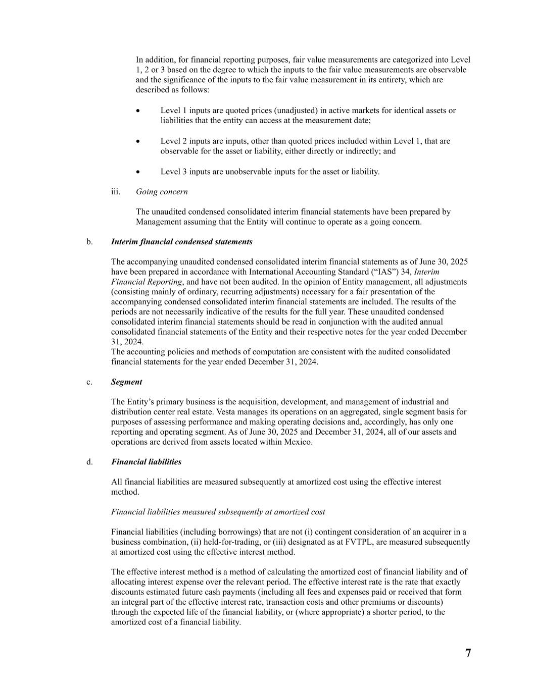 7 In addition, for financial reporting purposes, fair value measurements are categorized into Level 1, 2 or 3 based on the degree to which the inputs to the fair value measurements are observable and the significance of the inputs to the fair value measurement in its entirety, which are described as follows: • Level 1 inputs are quoted prices (unadjusted) in active markets for identical assets or liabilities that the entity can access at the measurement date; • Level 2 inputs are inputs, other than quoted prices included within Level 1, that are observable for the asset or liability, either directly or indirectly; and • Level 3 inputs are unobservable inputs for the asset or liability. iii. Going concern The unaudited condensed consolidated interim financial statements have been prepared by Management assuming that the Entity will continue to operate as a going concern. b. Interim financial condensed statements The accompanying unaudited condensed consolidated interim financial statements as of June 30, 2025 have been prepared in accordance with International Accounting Standard (“IAS”) 34, Interim Financial Reporting, and have not been audited. In the opinion of Entity management, all adjustments (consisting mainly of ordinary, recurring adjustments) necessary for a fair presentation of the accompanying condensed consolidated interim financial statements are included. The results of the periods are not necessarily indicative of the results for the full year. These unaudited condensed consolidated interim financial statements should be read in conjunction with the audited annual consolidated financial statements of the Entity and their respective notes for the year ended December 31, 2024. The accounting policies and methods of computation are consistent with the audited consolidated financial statements for the year ended December 31, 2024. c. Segment The Entity’s primary business is the acquisition, development, and management of industrial and distribution center real estate. Vesta manages its operations on an aggregated, single segment basis for purposes of assessing performance and making operating decisions and, accordingly, has only one reporting and operating segment. As of June 30, 2025 and December 31, 2024, all of our assets and operations are derived from assets located within Mexico. d. Financial liabilities All financial liabilities are measured subsequently at amortized cost using the effective interest method. Financial liabilities measured subsequently at amortized cost Financial liabilities (including borrowings) that are not (i) contingent consideration of an acquirer in a business combination, (ii) held-for-trading, or (iii) designated as at FVTPL, are measured subsequently at amortized cost using the effective interest method. The effective interest method is a method of calculating the amortized cost of financial liability and of allocating interest expense over the relevant period. The effective interest rate is the rate that exactly discounts estimated future cash payments (including all fees and expenses paid or received that form an integral part of the effective interest rate, transaction costs and other premiums or discounts) through the expected life of the financial liability, or (where appropriate) a shorter period, to the amortized cost of a financial liability.