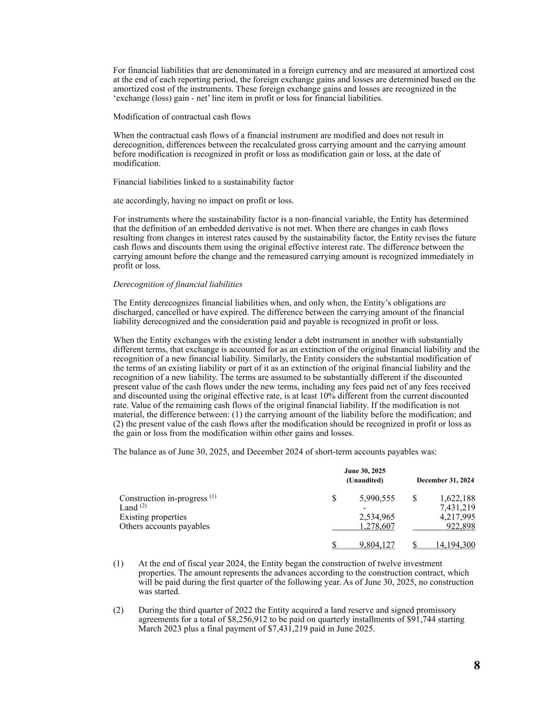 8 For financial liabilities that are denominated in a foreign currency and are measured at amortized cost at the end of each reporting period, the foreign exchange gains and losses are determined based on the amortized cost of the instruments. These foreign exchange gains and losses are recognized in the ‘exchange (loss) gain - net’ line item in profit or loss for financial liabilities. Modification of contractual cash flows When the contractual cash flows of a financial instrument are modified and does not result in derecognition, differences between the recalculated gross carrying amount and the carrying amount before modification is recognized in profit or loss as modification gain or loss, at the date of modification. Financial liabilities linked to a sustainability factor ate accordingly, having no impact on profit or loss. For instruments where the sustainability factor is a non-financial variable, the Entity has determined that the definition of an embedded derivative is not met. When there are changes in cash flows resulting from changes in interest rates caused by the sustainability factor, the Entity revises the future cash flows and discounts them using the original effective interest rate. The difference between the carrying amount before the change and the remeasured carrying amount is recognized immediately in profit or loss. Derecognition of financial liabilities The Entity derecognizes financial liabilities when, and only when, the Entity’s obligations are discharged, cancelled or have expired. The difference between the carrying amount of the financial liability derecognized and the consideration paid and payable is recognized in profit or loss. When the Entity exchanges with the existing lender a debt instrument in another with substantially different terms, that exchange is accounted for as an extinction of the original financial liability and the recognition of a new financial liability. Similarly, the Entity considers the substantial modification of the terms of an existing liability or part of it as an extinction of the original financial liability and the recognition of a new liability. The terms are assumed to be substantially different if the discounted present value of the cash flows under the new terms, including any fees paid net of any fees received and discounted using the original effective rate, is at least 10% different from the current discounted rate. Value of the remaining cash flows of the original financial liability. If the modification is not material, the difference between: (1) the carrying amount of the liability before the modification; and (2) the present value of the cash flows after the modification should be recognized in profit or loss as the gain or loss from the modification within other gains and losses. The balance as of June 30, 2025, and December 2024 of short-term accounts payables was: June 30, 2025 (Unaudited) December 31, 2024 Construction in-progress (1) $ 5,990,555 $ 1,622,188 Land (2) - 7,431,219 Existing properties 2,534,965 4,217,995 Others accounts payables 1,278,607 922,898 $ 9,804,127 $ 14,194,300 (1) At the end of fiscal year 2024, the Entity began the construction of twelve investment properties. The amount represents the advances according to the construction contract, which will be paid during the first quarter of the following year. As of June 30, 2025, no construction was started. (2) During the third quarter of 2022 the Entity acquired a land reserve and signed promissory agreements for a total of $8,256,912 to be paid on quarterly installments of $91,744 starting March 2023 plus a final payment of $7,431,219 paid in June 2025.
