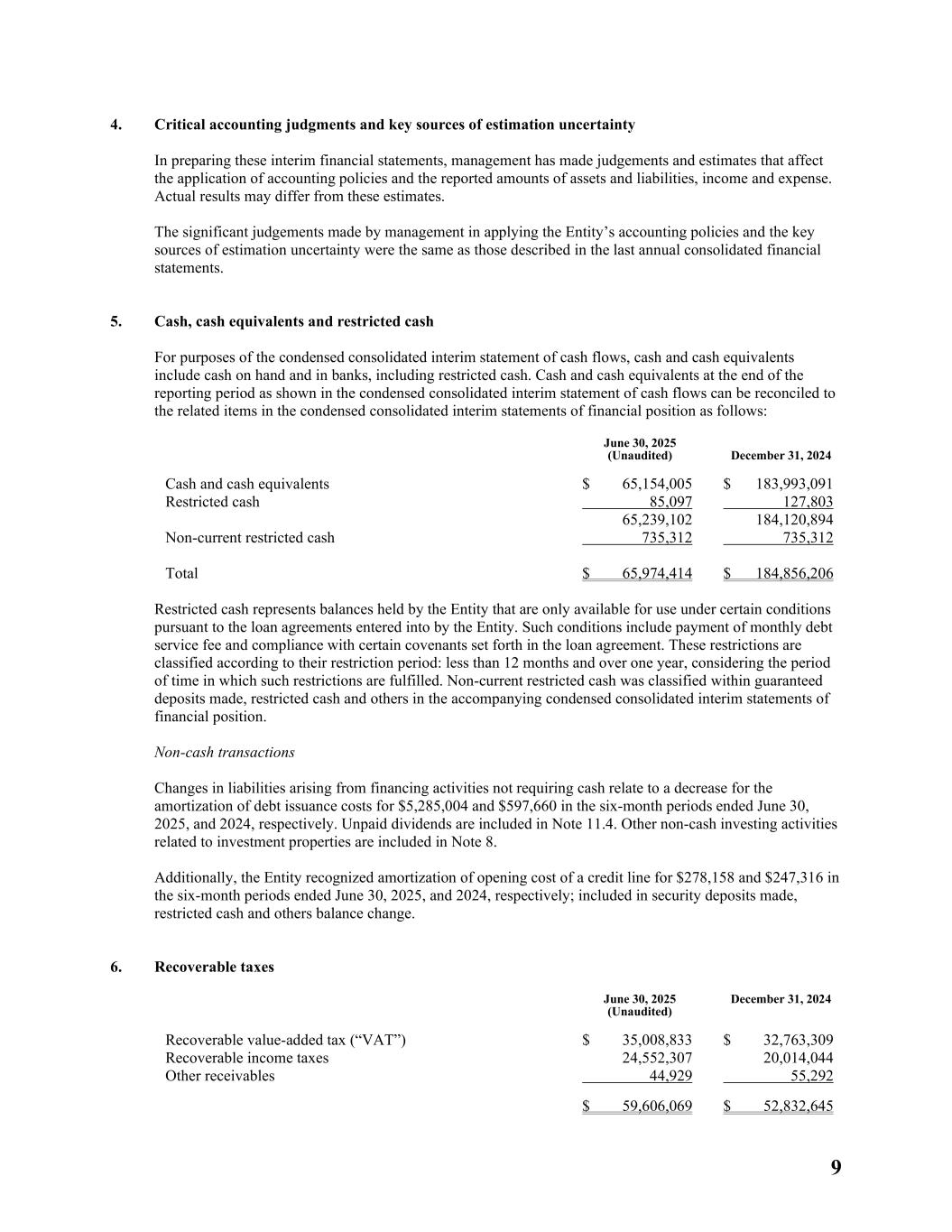 9 4. Critical accounting judgments and key sources of estimation uncertainty In preparing these interim financial statements, management has made judgements and estimates that affect the application of accounting policies and the reported amounts of assets and liabilities, income and expense. Actual results may differ from these estimates. The significant judgements made by management in applying the Entity’s accounting policies and the key sources of estimation uncertainty were the same as those described in the last annual consolidated financial statements. 5. Cash, cash equivalents and restricted cash For purposes of the condensed consolidated interim statement of cash flows, cash and cash equivalents include cash on hand and in banks, including restricted cash. Cash and cash equivalents at the end of the reporting period as shown in the condensed consolidated interim statement of cash flows can be reconciled to the related items in the condensed consolidated interim statements of financial position as follows: June 30, 2025 (Unaudited) December 31, 2024 Cash and cash equivalents $ 65,154,005 $ 183,993,091 Restricted cash 85,097 127,803 65,239,102 184,120,894 Non-current restricted cash 735,312 735,312 Total $ 65,974,414 $ 184,856,206 Restricted cash represents balances held by the Entity that are only available for use under certain conditions pursuant to the loan agreements entered into by the Entity. Such conditions include payment of monthly debt service fee and compliance with certain covenants set forth in the loan agreement. These restrictions are classified according to their restriction period: less than 12 months and over one year, considering the period of time in which such restrictions are fulfilled. Non-current restricted cash was classified within guaranteed deposits made, restricted cash and others in the accompanying condensed consolidated interim statements of financial position. Non‑cash transactions Changes in liabilities arising from financing activities not requiring cash relate to a decrease for the amortization of debt issuance costs for $5,285,004 and $597,660 in the six-month periods ended June 30, 2025, and 2024, respectively. Unpaid dividends are included in Note 11.4. Other non-cash investing activities related to investment properties are included in Note 8. Additionally, the Entity recognized amortization of opening cost of a credit line for $278,158 and $247,316 in the six-month periods ended June 30, 2025, and 2024, respectively; included in security deposits made, restricted cash and others balance change. 6. Recoverable taxes June 30, 2025 (Unaudited) December 31, 2024 Recoverable value-added tax (“VAT”) $ 35,008,833 $ 32,763,309 Recoverable income taxes 24,552,307 20,014,044 Other receivables 44,929 55,292 $ 59,606,069 $ 52,832,645