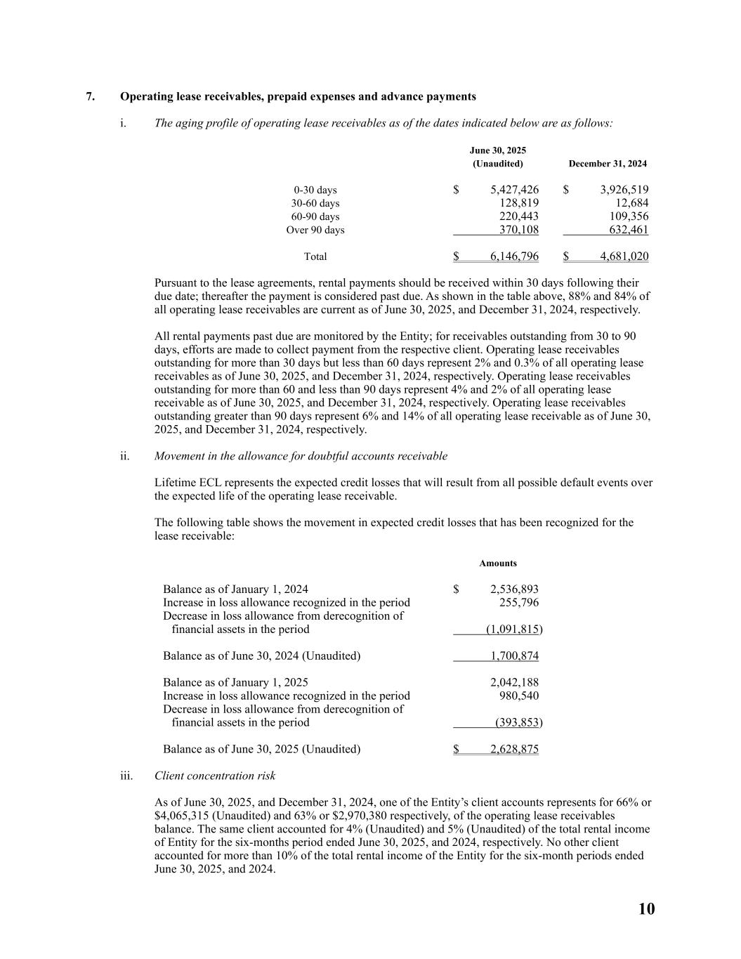 10 7. Operating lease receivables, prepaid expenses and advance payments i. The aging profile of operating lease receivables as of the dates indicated below are as follows: June 30, 2025 (Unaudited) December 31, 2024 0-30 days $ 5,427,426 $ 3,926,519 30-60 days 128,819 12,684 60-90 days 220,443 109,356 Over 90 days 370,108 632,461 Total $ 6,146,796 $ 4,681,020 Pursuant to the lease agreements, rental payments should be received within 30 days following their due date; thereafter the payment is considered past due. As shown in the table above, 88% and 84% of all operating lease receivables are current as of June 30, 2025, and December 31, 2024, respectively. All rental payments past due are monitored by the Entity; for receivables outstanding from 30 to 90 days, efforts are made to collect payment from the respective client. Operating lease receivables outstanding for more than 30 days but less than 60 days represent 2% and 0.3% of all operating lease receivables as of June 30, 2025, and December 31, 2024, respectively. Operating lease receivables outstanding for more than 60 and less than 90 days represent 4% and 2% of all operating lease receivable as of June 30, 2025, and December 31, 2024, respectively. Operating lease receivables outstanding greater than 90 days represent 6% and 14% of all operating lease receivable as of June 30, 2025, and December 31, 2024, respectively. ii. Movement in the allowance for doubtful accounts receivable Lifetime ECL represents the expected credit losses that will result from all possible default events over the expected life of the operating lease receivable. The following table shows the movement in expected credit losses that has been recognized for the lease receivable: Amounts Balance as of January 1, 2024 $ 2,536,893 Increase in loss allowance recognized in the period 255,796 Decrease in loss allowance from derecognition of financial assets in the period (1,091,815) Balance as of June 30, 2024 (Unaudited) 1,700,874 Balance as of January 1, 2025 2,042,188 Increase in loss allowance recognized in the period 980,540 Decrease in loss allowance from derecognition of financial assets in the period (393,853) Balance as of June 30, 2025 (Unaudited) $ 2,628,875 iii. Client concentration risk As of June 30, 2025, and December 31, 2024, one of the Entity’s client accounts represents for 66% or $4,065,315 (Unaudited) and 63% or $2,970,380 respectively, of the operating lease receivables balance. The same client accounted for 4% (Unaudited) and 5% (Unaudited) of the total rental income of Entity for the six-months period ended June 30, 2025, and 2024, respectively. No other client accounted for more than 10% of the total rental income of the Entity for the six-month periods ended June 30, 2025, and 2024.