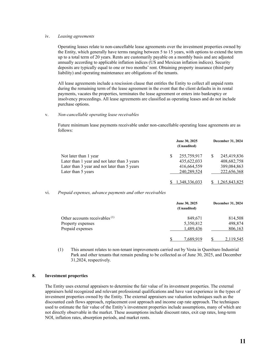 11 iv. Leasing agreements Operating leases relate to non-cancellable lease agreements over the investment properties owned by the Entity, which generally have terms ranging between 5 to 15 years, with options to extend the term up to a total term of 20 years. Rents are customarily payable on a monthly basis and are adjusted annually according to applicable inflation indices (US and Mexican inflation indices). Security deposits are typically equal to one or two months’ rent. Obtaining property insurance (third party liability) and operating maintenance are obligations of the tenants. All lease agreements include a rescission clause that entitles the Entity to collect all unpaid rents during the remaining term of the lease agreement in the event that the client defaults in its rental payments, vacates the properties, terminates the lease agreement or enters into bankruptcy or insolvency proceedings. All lease agreements are classified as operating leases and do not include purchase options. v. Non-cancellable operating lease receivables Future minimum lease payments receivable under non-cancellable operating lease agreements are as follows: June 30, 2025 (Unaudited) December 31, 2024 Not later than 1 year $ 255,759,917 $ 245,419,836 Later than 1 year and not later than 3 years 435,622,033 408,682,758 Later than 3 year and not later than 5 years 416,664,559 389,084,863 Later than 5 years 240,289,524 222,656,368 $ 1,348,336,033 $ 1,265,843,825 vi. Prepaid expenses, advance payments and other receivables June 30, 2025 (Unaudited) December 31, 2024 Other accounts receivables (1) 849,671 814,508 Property expenses 5,350,812 498,874 Prepaid expenses 1,489,436 806,163 $ 7,689,919 $ 2,119,545 (1) This amount relates to non-tenant improvements carried out by Vesta in Querétaro Industrial Park and other tenants that remain pending to be collected as of June 30, 2025, and December 31,2024, respectively. 8. Investment properties The Entity uses external appraisers to determine the fair value of its investment properties. The external appraisers hold recognized and relevant professional qualifications and have vast experience in the types of investment properties owned by the Entity. The external appraisers use valuation techniques such as the discounted cash flows approach, replacement cost approach and income cap rate approach. The techniques used to estimate the fair value of the Entity’s investment properties include assumptions, many of which are not directly observable in the market. These assumptions include discount rates, exit cap rates, long-term NOI, inflation rates, absorption periods, and market rents.