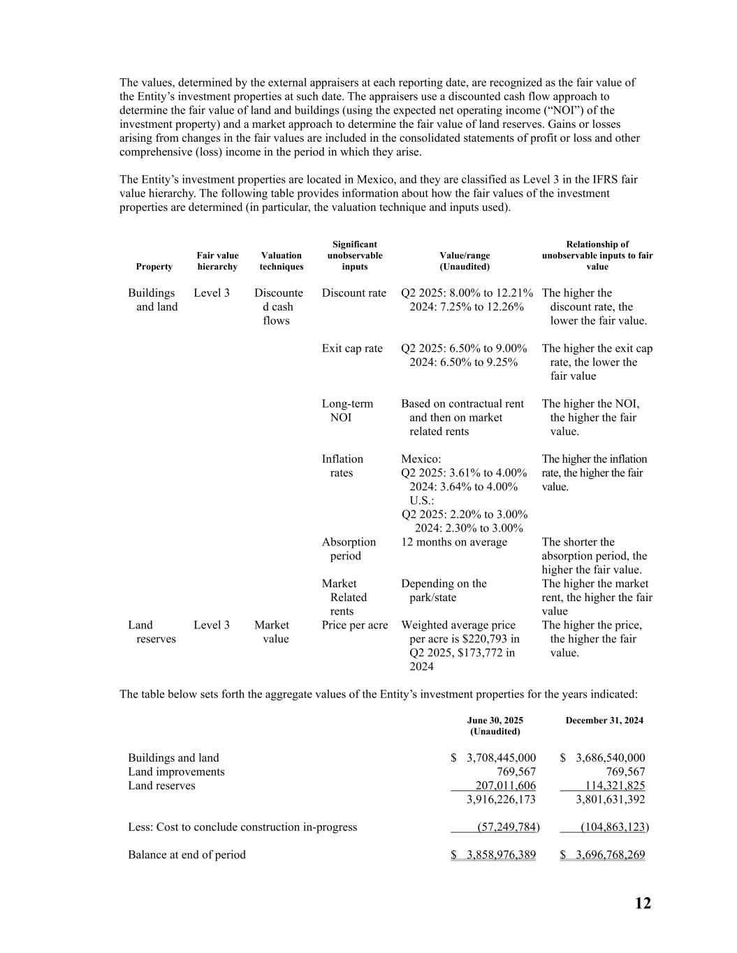 12 The values, determined by the external appraisers at each reporting date, are recognized as the fair value of the Entity’s investment properties at such date. The appraisers use a discounted cash flow approach to determine the fair value of land and buildings (using the expected net operating income (“NOI”) of the investment property) and a market approach to determine the fair value of land reserves. Gains or losses arising from changes in the fair values are included in the consolidated statements of profit or loss and other comprehensive (loss) income in the period in which they arise. The Entity’s investment properties are located in Mexico, and they are classified as Level 3 in the IFRS fair value hierarchy. The following table provides information about how the fair values of the investment properties are determined (in particular, the valuation technique and inputs used). Property Fair value hierarchy Valuation techniques Significant unobservable inputs Value/range (Unaudited) Relationship of unobservable inputs to fair value Buildings and land Level 3 Discounte d cash flows Discount rate Q2 2025: 8.00% to 12.21% 2024: 7.25% to 12.26% The higher the discount rate, the lower the fair value. Exit cap rate Q2 2025: 6.50% to 9.00% 2024: 6.50% to 9.25% The higher the exit cap rate, the lower the fair value Long-term NOI Based on contractual rent and then on market related rents The higher the NOI, the higher the fair value. Inflation rates Mexico: Q2 2025: 3.61% to 4.00% 2024: 3.64% to 4.00% U.S.: Q2 2025: 2.20% to 3.00% 2024: 2.30% to 3.00% The higher the inflation rate, the higher the fair value. Absorption period 12 months on average The shorter the absorption period, the higher the fair value. Market Related rents Depending on the park/state The higher the market rent, the higher the fair value Land reserves Level 3 Market value Price per acre Weighted average price per acre is $220,793 in Q2 2025, $173,772 in 2024 The higher the price, the higher the fair value. The table below sets forth the aggregate values of the Entity’s investment properties for the years indicated: June 30, 2025 (Unaudited) December 31, 2024 Buildings and land $ 3,708,445,000 $ 3,686,540,000 Land improvements 769,567 769,567 Land reserves 207,011,606 114,321,825 3,916,226,173 3,801,631,392 Less: Cost to conclude construction in-progress (57,249,784) (104,863,123) Balance at end of period $ 3,858,976,389 $ 3,696,768,269