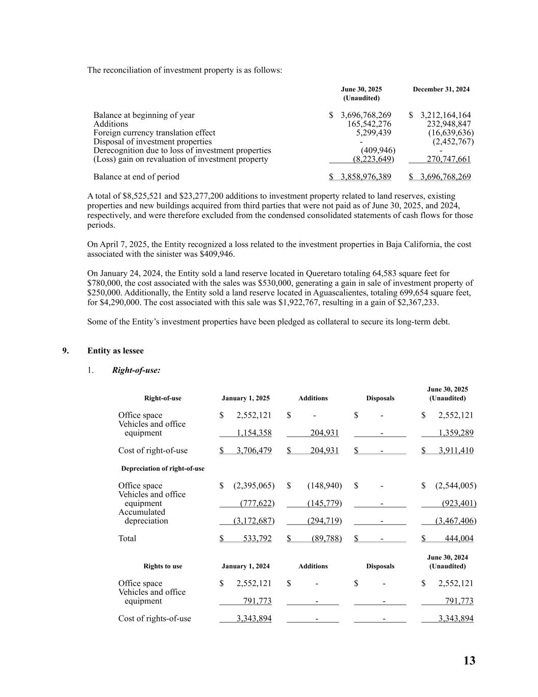 13 The reconciliation of investment property is as follows: June 30, 2025 (Unaudited) December 31, 2024 Balance at beginning of year $ 3,696,768,269 $ 3,212,164,164 Additions 165,542,276 232,948,847 Foreign currency translation effect 5,299,439 (16,639,636) Disposal of investment properties - (2,452,767) Derecognition due to loss of investment properties (409,946) - (Loss) gain on revaluation of investment property (8,223,649) 270,747,661 Balance at end of period $ 3,858,976,389 $ 3,696,768,269 A total of $8,525,521 and $23,277,200 additions to investment property related to land reserves, existing properties and new buildings acquired from third parties that were not paid as of June 30, 2025, and 2024, respectively, and were therefore excluded from the condensed consolidated statements of cash flows for those periods. On April 7, 2025, the Entity recognized a loss related to the investment properties in Baja California, the cost associated with the sinister was $409,946. On January 24, 2024, the Entity sold a land reserve located in Queretaro totaling 64,583 square feet for $780,000, the cost associated with the sales was $530,000, generating a gain in sale of investment property of $250,000. Additionally, the Entity sold a land reserve located in Aguascalientes, totaling 699,654 square feet, for $4,290,000. The cost associated with this sale was $1,922,767, resulting in a gain of $2,367,233. Some of the Entity’s investment properties have been pledged as collateral to secure its long-term debt. 9. Entity as lessee 1. Right-of-use: Right-of-use January 1, 2025 Additions Disposals June 30, 2025 (Unaudited) Office space $ 2,552,121 $ - $ - $ 2,552,121 Vehicles and office equipment 1,154,358 204,931 - 1,359,289 Cost of right-of-use $ 3,706,479 $ 204,931 $ - $ 3,911,410 Depreciation of right-of-use Office space $ (2,395,065) $ (148,940) $ - $ (2,544,005) Vehicles and office equipment (777,622) (145,779) - (923,401) Accumulated depreciation (3,172,687) (294,719) - (3,467,406) Total $ 533,792 $ (89,788) $ - $ 444,004 Rights to use January 1, 2024 Additions Disposals June 30, 2024 (Unaudited) Office space $ 2,552,121 $ - $ - $ 2,552,121 Vehicles and office equipment 791,773 - - 791,773 Cost of rights-of-use 3,343,894 - - 3,343,894
