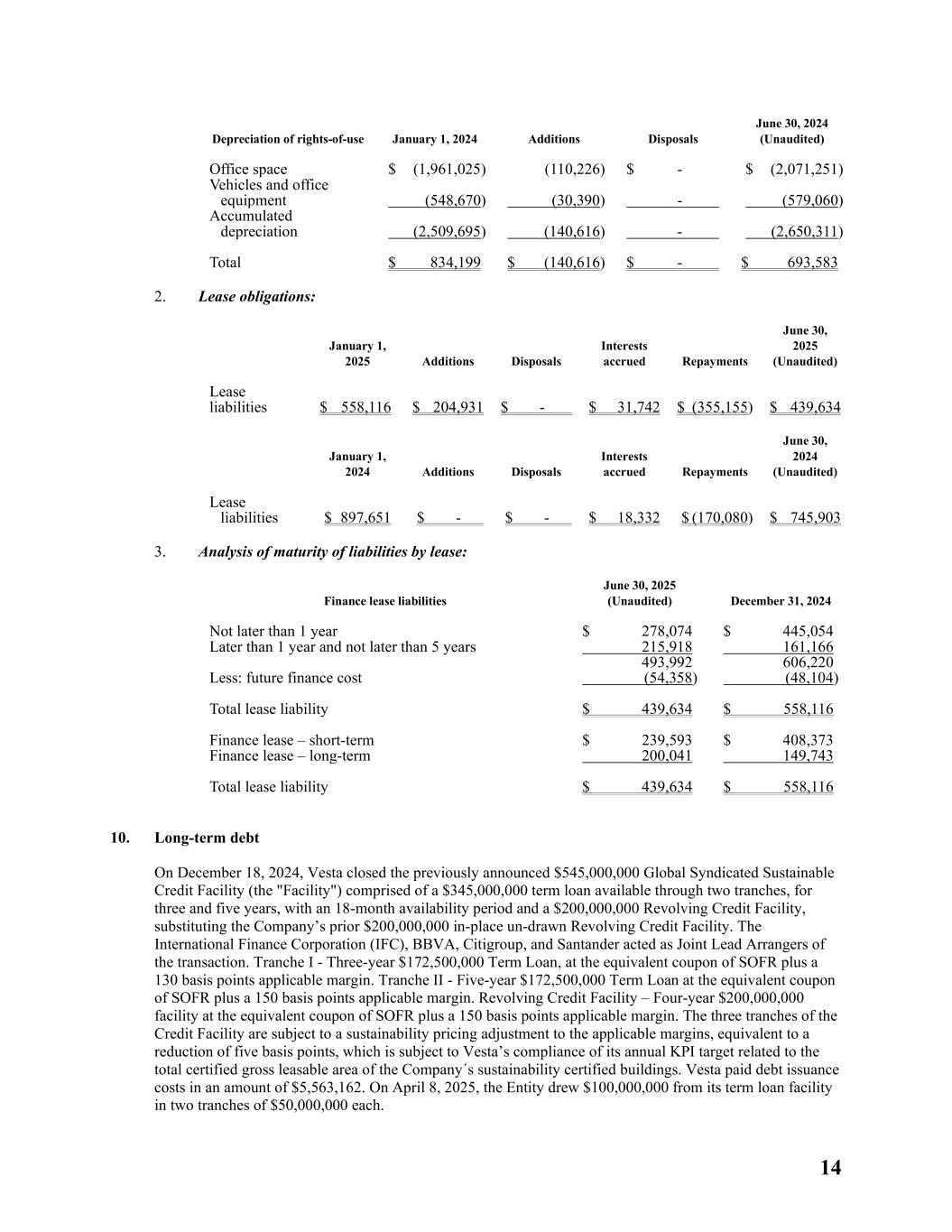 14 Depreciation of rights-of-use January 1, 2024 Additions Disposals June 30, 2024 (Unaudited) Office space $ (1,961,025) (110,226) $ - $ (2,071,251) Vehicles and office equipment (548,670) (30,390) - (579,060) Accumulated depreciation (2,509,695) (140,616) - (2,650,311) Total $ 834,199 $ (140,616) $ - $ 693,583 2. Lease obligations: January 1, 2025 Additions Disposals Interests accrued Repayments June 30, 2025 (Unaudited) Lease liabilities $ 558,116 $ 204,931 $ - $ 31,742 $ (355,155) $ 439,634 January 1, 2024 Additions Disposals Interests accrued Repayments June 30, 2024 (Unaudited) Lease liabilities $ 897,651 $ - $ - $ 18,332 $ (170,080) $ 745,903 3. Analysis of maturity of liabilities by lease: Finance lease liabilities June 30, 2025 (Unaudited) December 31, 2024 Not later than 1 year $ 278,074 $ 445,054 Later than 1 year and not later than 5 years 215,918 161,166 493,992 606,220 Less: future finance cost (54,358) (48,104) Total lease liability $ 439,634 $ 558,116 Finance lease – short-term $ 239,593 $ 408,373 Finance lease – long-term 200,041 149,743 Total lease liability $ 439,634 $ 558,116 10. Long-term debt On December 18, 2024, Vesta closed the previously announced $545,000,000 Global Syndicated Sustainable Credit Facility (the "Facility") comprised of a $345,000,000 term loan available through two tranches, for three and five years, with an 18-month availability period and a $200,000,000 Revolving Credit Facility, substituting the Company’s prior $200,000,000 in-place un-drawn Revolving Credit Facility. The International Finance Corporation (IFC), BBVA, Citigroup, and Santander acted as Joint Lead Arrangers of the transaction. Tranche I - Three-year $172,500,000 Term Loan, at the equivalent coupon of SOFR plus a 130 basis points applicable margin. Tranche II - Five-year $172,500,000 Term Loan at the equivalent coupon of SOFR plus a 150 basis points applicable margin. Revolving Credit Facility – Four-year $200,000,000 facility at the equivalent coupon of SOFR plus a 150 basis points applicable margin. The three tranches of the Credit Facility are subject to a sustainability pricing adjustment to the applicable margins, equivalent to a reduction of five basis points, which is subject to Vesta’s compliance of its annual KPI target related to the total certified gross leasable area of the Company´s sustainability certified buildings. Vesta paid debt issuance costs in an amount of $5,563,162. On April 8, 2025, the Entity drew $100,000,000 from its term loan facility in two tranches of $50,000,000 each.