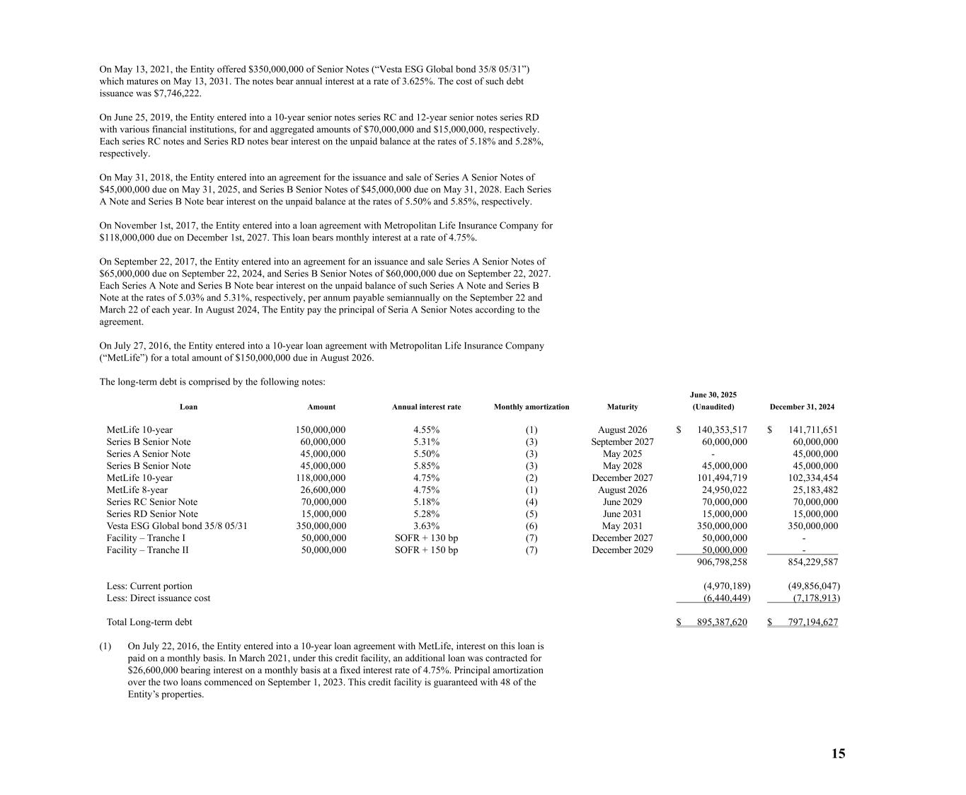 15 On May 13, 2021, the Entity offered $350,000,000 of Senior Notes (“Vesta ESG Global bond 35/8 05/31”) which matures on May 13, 2031. The notes bear annual interest at a rate of 3.625%. The cost of such debt issuance was $7,746,222. On June 25, 2019, the Entity entered into a 10-year senior notes series RC and 12-year senior notes series RD with various financial institutions, for and aggregated amounts of $70,000,000 and $15,000,000, respectively. Each series RC notes and Series RD notes bear interest on the unpaid balance at the rates of 5.18% and 5.28%, respectively. On May 31, 2018, the Entity entered into an agreement for the issuance and sale of Series A Senior Notes of $45,000,000 due on May 31, 2025, and Series B Senior Notes of $45,000,000 due on May 31, 2028. Each Series A Note and Series B Note bear interest on the unpaid balance at the rates of 5.50% and 5.85%, respectively. On November 1st, 2017, the Entity entered into a loan agreement with Metropolitan Life Insurance Company for $118,000,000 due on December 1st, 2027. This loan bears monthly interest at a rate of 4.75%. On September 22, 2017, the Entity entered into an agreement for an issuance and sale Series A Senior Notes of $65,000,000 due on September 22, 2024, and Series B Senior Notes of $60,000,000 due on September 22, 2027. Each Series A Note and Series B Note bear interest on the unpaid balance of such Series A Note and Series B Note at the rates of 5.03% and 5.31%, respectively, per annum payable semiannually on the September 22 and March 22 of each year. In August 2024, The Entity pay the principal of Seria A Senior Notes according to the agreement. On July 27, 2016, the Entity entered into a 10-year loan agreement with Metropolitan Life Insurance Company (“MetLife”) for a total amount of $150,000,000 due in August 2026. The long-term debt is comprised by the following notes: Loan Amount Annual interest rate Monthly amortization Maturity June 30, 2025 (Unaudited) December 31, 2024 MetLife 10-year 150,000,000 4.55% (1) August 2026 $ 140,353,517 $ 141,711,651 Series B Senior Note 60,000,000 5.31% (3) September 2027 60,000,000 60,000,000 Series A Senior Note 45,000,000 5.50% (3) May 2025 - 45,000,000 Series B Senior Note 45,000,000 5.85% (3) May 2028 45,000,000 45,000,000 MetLife 10-year 118,000,000 4.75% (2) December 2027 101,494,719 102,334,454 MetLife 8-year 26,600,000 4.75% (1) August 2026 24,950,022 25,183,482 Series RC Senior Note 70,000,000 5.18% (4) June 2029 70,000,000 70,000,000 Series RD Senior Note 15,000,000 5.28% (5) June 2031 15,000,000 15,000,000 Vesta ESG Global bond 35/8 05/31 350,000,000 3.63% (6) May 2031 350,000,000 350,000,000 Facility – Tranche I 50,000,000 SOFR + 130 bp (7) December 2027 50,000,000 - Facility – Tranche II 50,000,000 SOFR + 150 bp (7) December 2029 50,000,000 - 906,798,258 854,229,587 Less: Current portion (4,970,189) (49,856,047) Less: Direct issuance cost (6,440,449) (7,178,913) Total Long-term debt $ 895,387,620 $ 797,194,627 (1) On July 22, 2016, the Entity entered into a 10-year loan agreement with MetLife, interest on this loan is paid on a monthly basis. In March 2021, under this credit facility, an additional loan was contracted for $26,600,000 bearing interest on a monthly basis at a fixed interest rate of 4.75%. Principal amortization over the two loans commenced on September 1, 2023. This credit facility is guaranteed with 48 of the Entity’s properties.