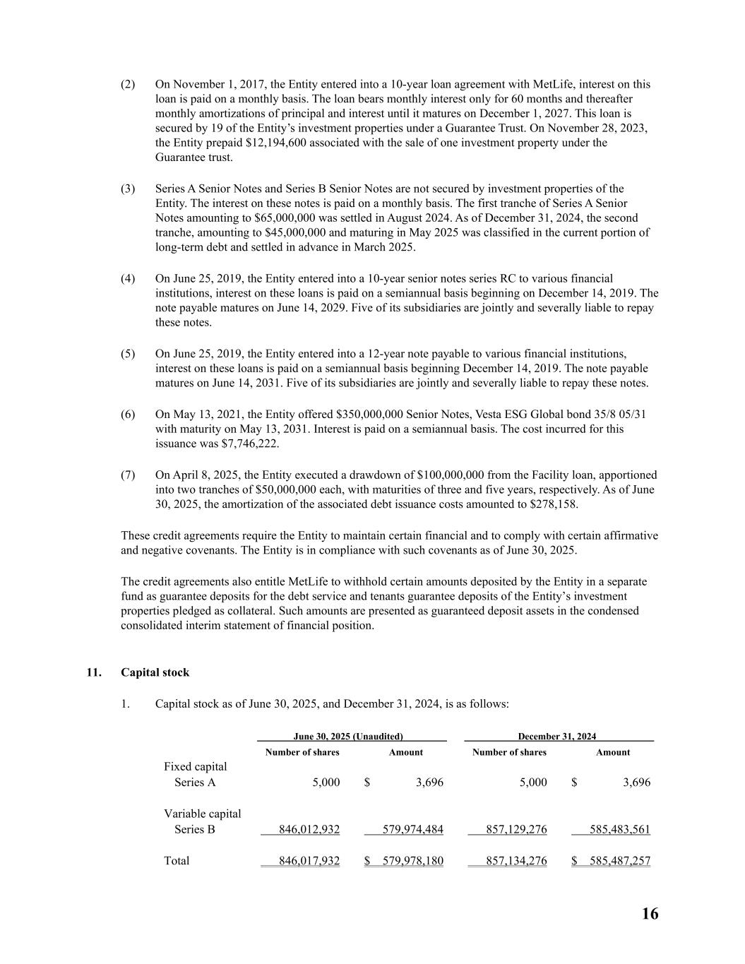 16 (2) On November 1, 2017, the Entity entered into a 10-year loan agreement with MetLife, interest on this loan is paid on a monthly basis. The loan bears monthly interest only for 60 months and thereafter monthly amortizations of principal and interest until it matures on December 1, 2027. This loan is secured by 19 of the Entity’s investment properties under a Guarantee Trust. On November 28, 2023, the Entity prepaid $12,194,600 associated with the sale of one investment property under the Guarantee trust. (3) Series A Senior Notes and Series B Senior Notes are not secured by investment properties of the Entity. The interest on these notes is paid on a monthly basis. The first tranche of Series A Senior Notes amounting to $65,000,000 was settled in August 2024. As of December 31, 2024, the second tranche, amounting to $45,000,000 and maturing in May 2025 was classified in the current portion of long-term debt and settled in advance in March 2025. (4) On June 25, 2019, the Entity entered into a 10-year senior notes series RC to various financial institutions, interest on these loans is paid on a semiannual basis beginning on December 14, 2019. The note payable matures on June 14, 2029. Five of its subsidiaries are jointly and severally liable to repay these notes. (5) On June 25, 2019, the Entity entered into a 12-year note payable to various financial institutions, interest on these loans is paid on a semiannual basis beginning December 14, 2019. The note payable matures on June 14, 2031. Five of its subsidiaries are jointly and severally liable to repay these notes. (6) On May 13, 2021, the Entity offered $350,000,000 Senior Notes, Vesta ESG Global bond 35/8 05/31 with maturity on May 13, 2031. Interest is paid on a semiannual basis. The cost incurred for this issuance was $7,746,222. (7) On April 8, 2025, the Entity executed a drawdown of $100,000,000 from the Facility loan, apportioned into two tranches of $50,000,000 each, with maturities of three and five years, respectively. As of June 30, 2025, the amortization of the associated debt issuance costs amounted to $278,158. These credit agreements require the Entity to maintain certain financial and to comply with certain affirmative and negative covenants. The Entity is in compliance with such covenants as of June 30, 2025. The credit agreements also entitle MetLife to withhold certain amounts deposited by the Entity in a separate fund as guarantee deposits for the debt service and tenants guarantee deposits of the Entity’s investment properties pledged as collateral. Such amounts are presented as guaranteed deposit assets in the condensed consolidated interim statement of financial position. 11. Capital stock 1. Capital stock as of June 30, 2025, and December 31, 2024, is as follows: June 30, 2025 (Unaudited) December 31, 2024 Number of shares Amount Number of shares Amount Fixed capital Series A 5,000 $ 3,696 5,000 $ 3,696 Variable capital Series B 846,012,932 579,974,484 857,129,276 585,483,561 Total 846,017,932 $ 579,978,180 857,134,276 $ 585,487,257