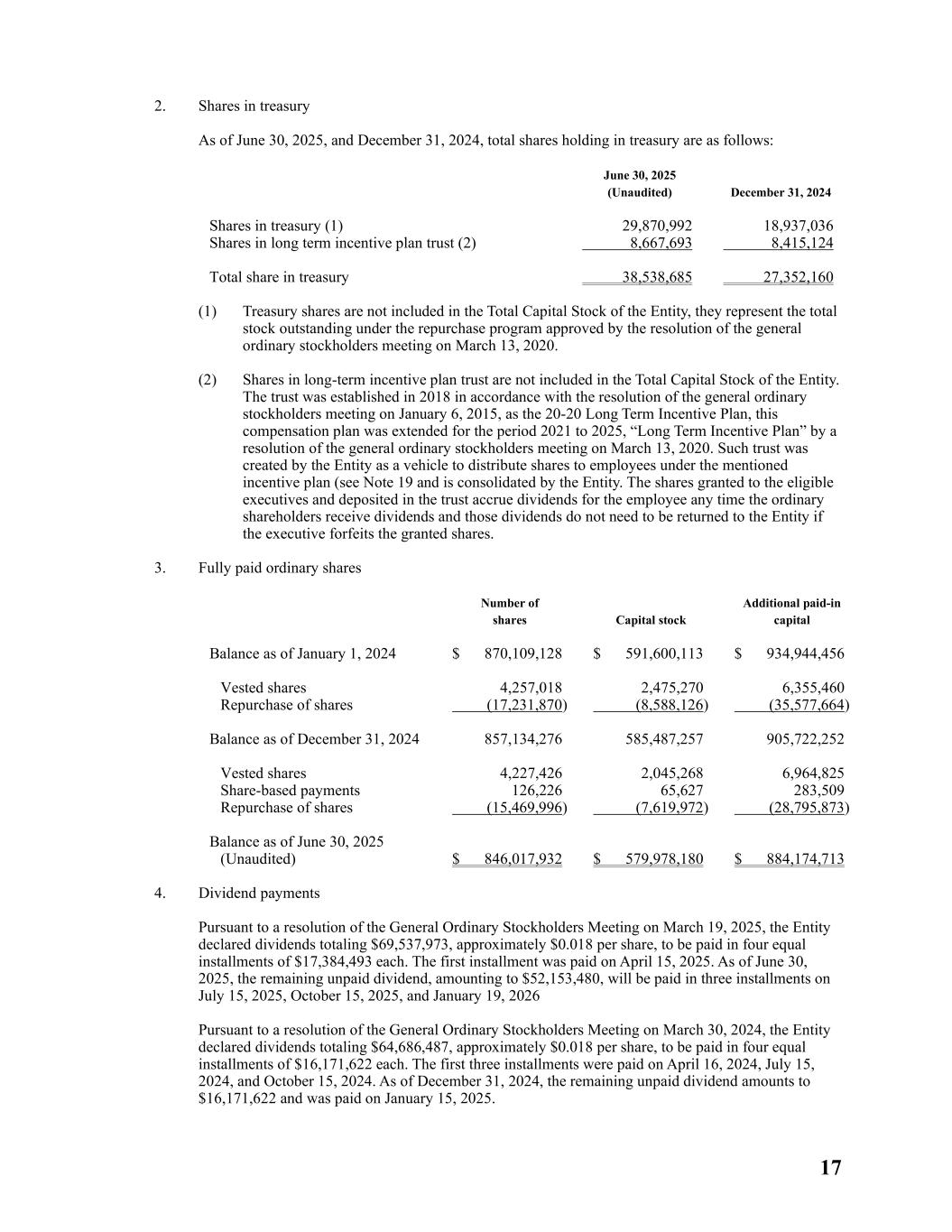 17 2. Shares in treasury As of June 30, 2025, and December 31, 2024, total shares holding in treasury are as follows: June 30, 2025 (Unaudited) December 31, 2024 Shares in treasury (1) 29,870,992 18,937,036 Shares in long term incentive plan trust (2) 8,667,693 8,415,124 Total share in treasury 38,538,685 27,352,160 (1) Treasury shares are not included in the Total Capital Stock of the Entity, they represent the total stock outstanding under the repurchase program approved by the resolution of the general ordinary stockholders meeting on March 13, 2020. (2) Shares in long-term incentive plan trust are not included in the Total Capital Stock of the Entity. The trust was established in 2018 in accordance with the resolution of the general ordinary stockholders meeting on January 6, 2015, as the 20-20 Long Term Incentive Plan, this compensation plan was extended for the period 2021 to 2025, “Long Term Incentive Plan” by a resolution of the general ordinary stockholders meeting on March 13, 2020. Such trust was created by the Entity as a vehicle to distribute shares to employees under the mentioned incentive plan (see Note 19 and is consolidated by the Entity. The shares granted to the eligible executives and deposited in the trust accrue dividends for the employee any time the ordinary shareholders receive dividends and those dividends do not need to be returned to the Entity if the executive forfeits the granted shares. 3. Fully paid ordinary shares Number of shares Capital stock Additional paid-in capital Balance as of January 1, 2024 $ 870,109,128 $ 591,600,113 $ 934,944,456 Vested shares 4,257,018 2,475,270 6,355,460 Repurchase of shares (17,231,870) (8,588,126) (35,577,664) Balance as of December 31, 2024 857,134,276 585,487,257 905,722,252 Vested shares 4,227,426 2,045,268 6,964,825 Share-based payments 126,226 65,627 283,509 Repurchase of shares (15,469,996) (7,619,972) (28,795,873) Balance as of June 30, 2025 (Unaudited) $ 846,017,932 $ 579,978,180 $ 884,174,713 4. Dividend payments Pursuant to a resolution of the General Ordinary Stockholders Meeting on March 19, 2025, the Entity declared dividends totaling $69,537,973, approximately $0.018 per share, to be paid in four equal installments of $17,384,493 each. The first installment was paid on April 15, 2025. As of June 30, 2025, the remaining unpaid dividend, amounting to $52,153,480, will be paid in three installments on July 15, 2025, October 15, 2025, and January 19, 2026 Pursuant to a resolution of the General Ordinary Stockholders Meeting on March 30, 2024, the Entity declared dividends totaling $64,686,487, approximately $0.018 per share, to be paid in four equal installments of $16,171,622 each. The first three installments were paid on April 16, 2024, July 15, 2024, and October 15, 2024. As of December 31, 2024, the remaining unpaid dividend amounts to $16,171,622 and was paid on January 15, 2025.