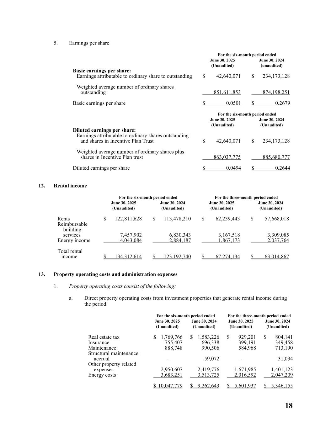 18 5. Earnings per share For the six-month period ended June 30, 2025 (Unaudited) June 30, 2024 (unaudited) Basic earnings per share: Earnings attributable to ordinary share to outstanding $ 42,640,071 $ 234,173,128 Weighted average number of ordinary shares outstanding 851,611,853 874,198,251 Basic earnings per share $ 0.0501 $ 0.2679 For the six-month period ended June 30, 2025 (Unaudited) June 30, 2024 (Unaudited) Diluted earnings per share: Earnings attributable to ordinary shares outstanding and shares in Incentive Plan Trust $ 42,640,071 $ 234,173,128 Weighted average number of ordinary shares plus shares in Incentive Plan trust 863,037,775 885,680,777 Diluted earnings per share $ 0.0494 $ 0.2644 12. Rental income For the six-month period ended For the three-month period ended June 30, 2025 (Unaudited) June 30, 2024 (Unaudited) June 30, 2025 (Unaudited) June 30, 2024 (Unaudited) Rents $ 122,811,628 $ 113,478,210 $ 62,239,443 $ 57,668,018 Reimbursable building services 7,457,902 6,830,343 3,167,518 3,309,085 Energy income 4,043,084 2,884,187 1,867,173 2,037,764 Total rental income $ 134,312,614 $ 123,192,740 $ 67,274,134 $ 63,014,867 13. Property operating costs and administration expenses 1. Property operating costs consist of the following: a. Direct property operating costs from investment properties that generate rental income during the period: For the six-month period ended For the three-month period ended June 30, 2025 (Unaudited) June 30, 2024 (Unaudited) June 30, 2025 (Unaudited) June 30, 2024 (Unaudited) Real estate tax $ 1,769,766 $ 1,583,226 $ 929,201 $ 804,141 Insurance 755,407 696,338 399,191 349,458 Maintenance 888,748 990,506 584,968 713,190 Structural maintenance accrual - 59,072 - 31,034 Other property related expenses 2,950,607 2,419,776 1,671,985 1,401,123 Energy costs 3,683,251 3,513,725 2,016,592 2,047,209 $ 10,047,779 $ 9,262,643 $ 5,601,937 $ 5,346,155
