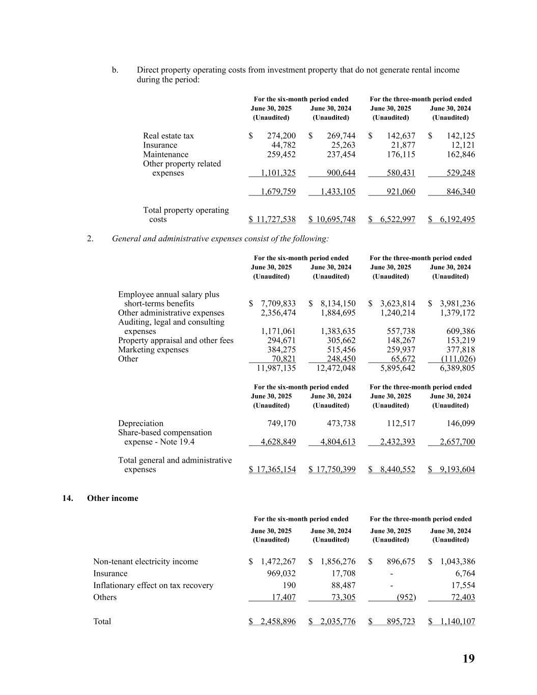 19 b. Direct property operating costs from investment property that do not generate rental income during the period: For the six-month period ended For the three-month period ended June 30, 2025 (Unaudited) June 30, 2024 (Unaudited) June 30, 2025 (Unaudited) June 30, 2024 (Unaudited) Real estate tax $ 274,200 $ 269,744 $ 142,637 $ 142,125 Insurance 44,782 25,263 21,877 12,121 Maintenance 259,452 237,454 176,115 162,846 Other property related expenses 1,101,325 900,644 580,431 529,248 1,679,759 1,433,105 921,060 846,340 Total property operating costs $ 11,727,538 $ 10,695,748 $ 6,522,997 $ 6,192,495 2. General and administrative expenses consist of the following: For the six-month period ended For the three-month period ended June 30, 2025 (Unaudited) June 30, 2024 (Unaudited) June 30, 2025 (Unaudited) June 30, 2024 (Unaudited) Employee annual salary plus short-terms benefits $ 7,709,833 $ 8,134,150 $ 3,623,814 $ 3,981,236 Other administrative expenses 2,356,474 1,884,695 1,240,214 1,379,172 Auditing, legal and consulting expenses 1,171,061 1,383,635 557,738 609,386 Property appraisal and other fees 294,671 305,662 148,267 153,219 Marketing expenses 384,275 515,456 259,937 377,818 Other 70,821 248,450 65,672 (111,026) 11,987,135 12,472,048 5,895,642 6,389,805 For the six-month period ended For the three-month period ended June 30, 2025 (Unaudited) June 30, 2024 (Unaudited) June 30, 2025 (Unaudited) June 30, 2024 (Unaudited) Depreciation 749,170 473,738 112,517 146,099 Share-based compensation expense - Note 19.4 4,628,849 4,804,613 2,432,393 2,657,700 Total general and administrative expenses $ 17,365,154 $ 17,750,399 $ 8,440,552 $ 9,193,604 14. Other income For the six-month period ended For the three-month period ended June 30, 2025 (Unaudited) June 30, 2024 (Unaudited) June 30, 2025 (Unaudited) June 30, 2024 (Unaudited) Non-tenant electricity income $ 1,472,267 $ 1,856,276 $ 896,675 $ 1,043,386 Insurance 969,032 17,708 - 6,764 Inflationary effect on tax recovery 190 88,487 - 17,554 Others 17,407 73,305 (952) 72,403 Total $ 2,458,896 $ 2,035,776 $ 895,723 $ 1,140,107