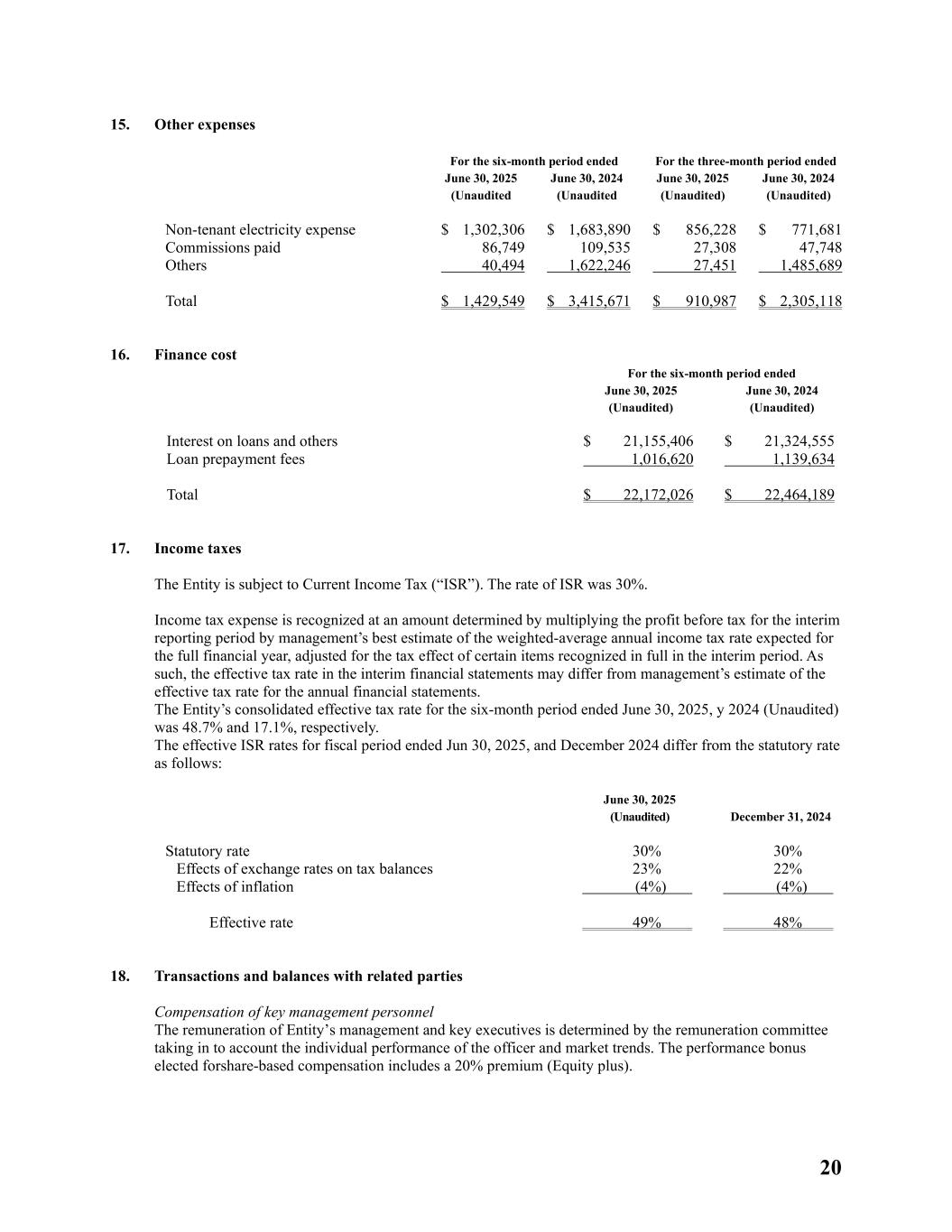20 15. Other expenses For the six-month period ended For the three-month period ended June 30, 2025 (Unaudited June 30, 2024 (Unaudited June 30, 2025 (Unaudited) June 30, 2024 (Unaudited) Non-tenant electricity expense $ 1,302,306 $ 1,683,890 $ 856,228 $ 771,681 Commissions paid 86,749 109,535 27,308 47,748 Others 40,494 1,622,246 27,451 1,485,689 Total $ 1,429,549 $ 3,415,671 $ 910,987 $ 2,305,118 16. Finance cost For the six-month period ended June 30, 2025 (Unaudited) June 30, 2024 (Unaudited) Interest on loans and others $ 21,155,406 $ 21,324,555 Loan prepayment fees 1,016,620 1,139,634 Total $ 22,172,026 $ 22,464,189 17. Income taxes The Entity is subject to Current Income Tax (“ISR”). The rate of ISR was 30%. Income tax expense is recognized at an amount determined by multiplying the profit before tax for the interim reporting period by management’s best estimate of the weighted-average annual income tax rate expected for the full financial year, adjusted for the tax effect of certain items recognized in full in the interim period. As such, the effective tax rate in the interim financial statements may differ from management’s estimate of the effective tax rate for the annual financial statements. The Entity’s consolidated effective tax rate for the six-month period ended June 30, 2025, y 2024 (Unaudited) was 48.7% and 17.1%, respectively. The effective ISR rates for fiscal period ended Jun 30, 2025, and December 2024 differ from the statutory rate as follows: June 30, 2025 (Unaudited) December 31, 2024 Statutory rate 30% 30% Effects of exchange rates on tax balances 23% 22% Effects of inflation (4%) (4%) Effective rate 49% 48% 18. Transactions and balances with related parties Compensation of key management personnel The remuneration of Entity’s management and key executives is determined by the remuneration committee taking in to account the individual performance of the officer and market trends. The performance bonus elected forshare-based compensation includes a 20% premium (Equity plus).